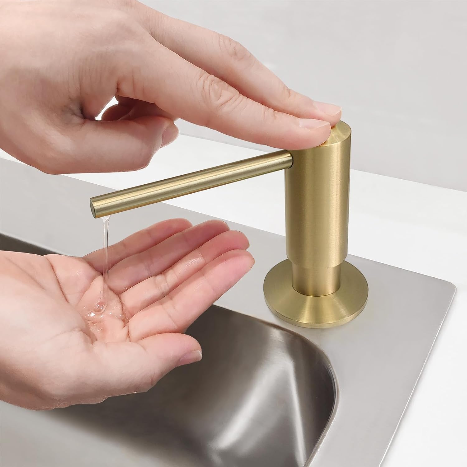 - Built To Last:Sturdy built in sink soap dispenser for kitchen sink, solid brass pump head and threaded tube with 17 OZ PET plastic bottle, corrosion resistant spring. SOLID BRASS CONSTRUCTION brushed gold rust resistant finish that will not tarnish as time goes on. The soap dispenser pump mechanism is designed for long lasting excellent performance to dispense consistently with each and every press. Coordinates with most faucet models from different brands.
