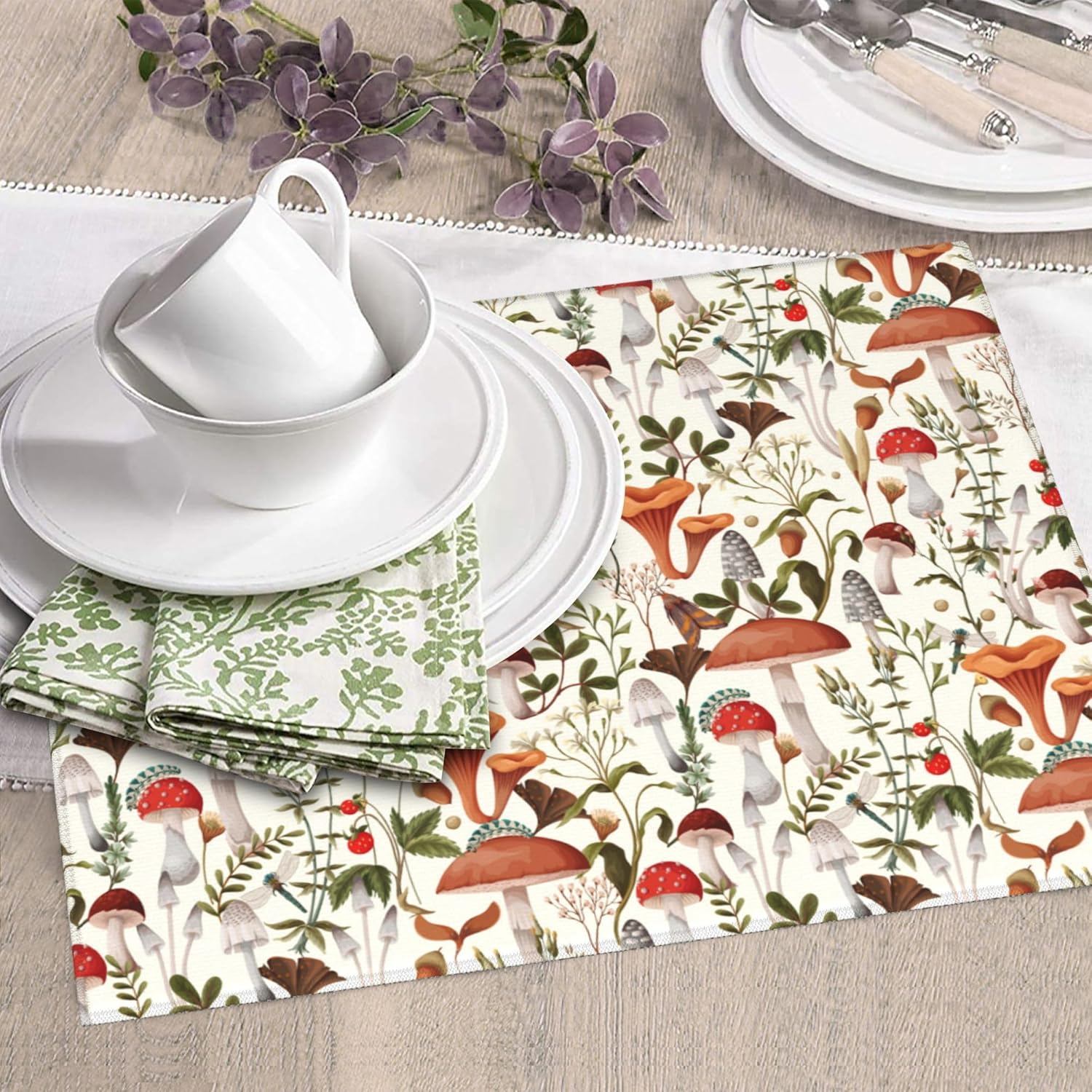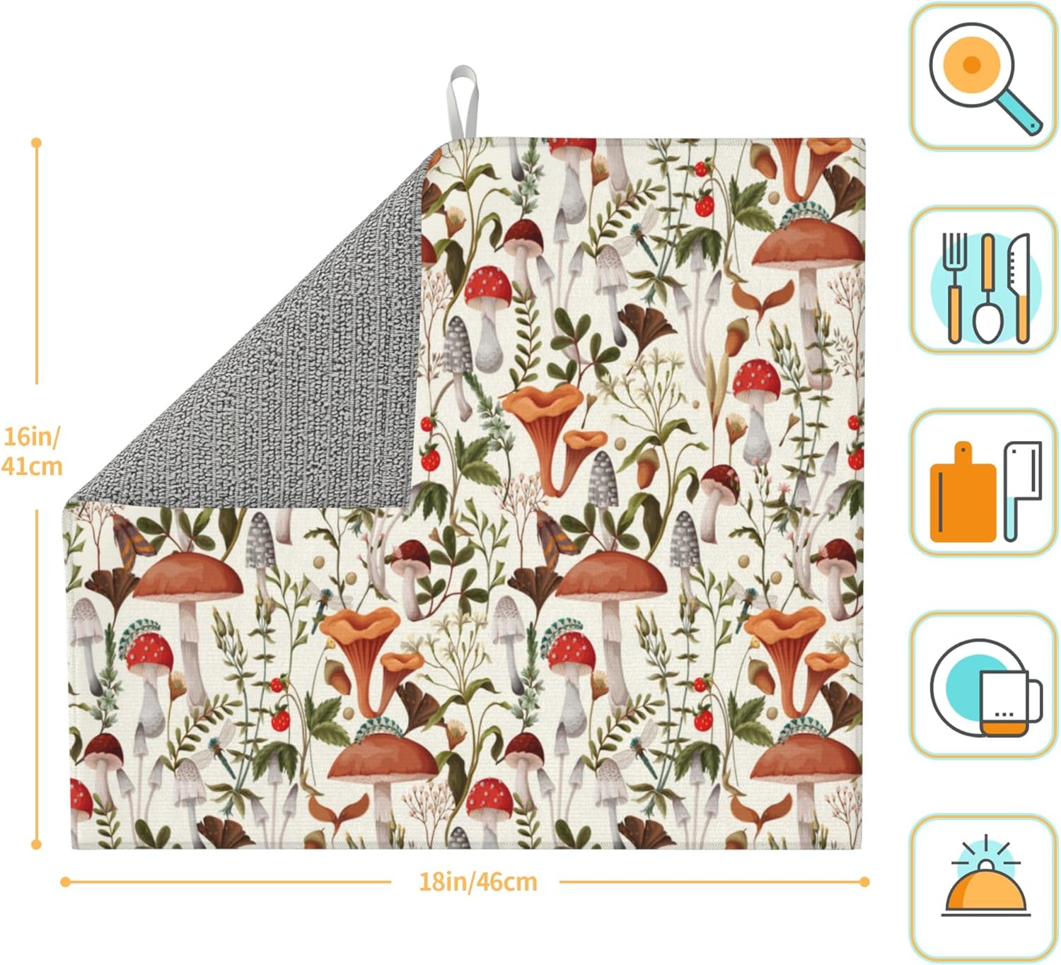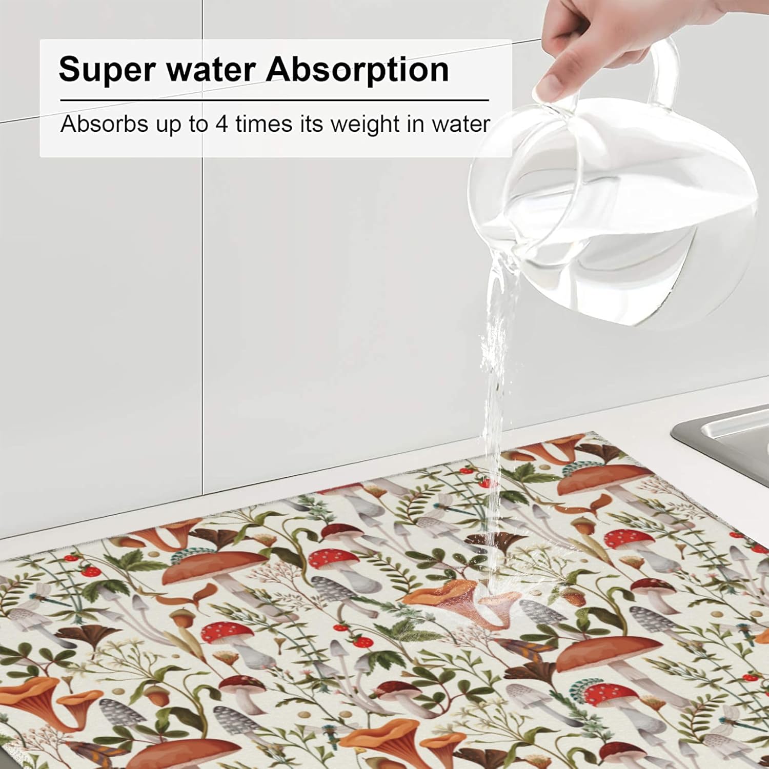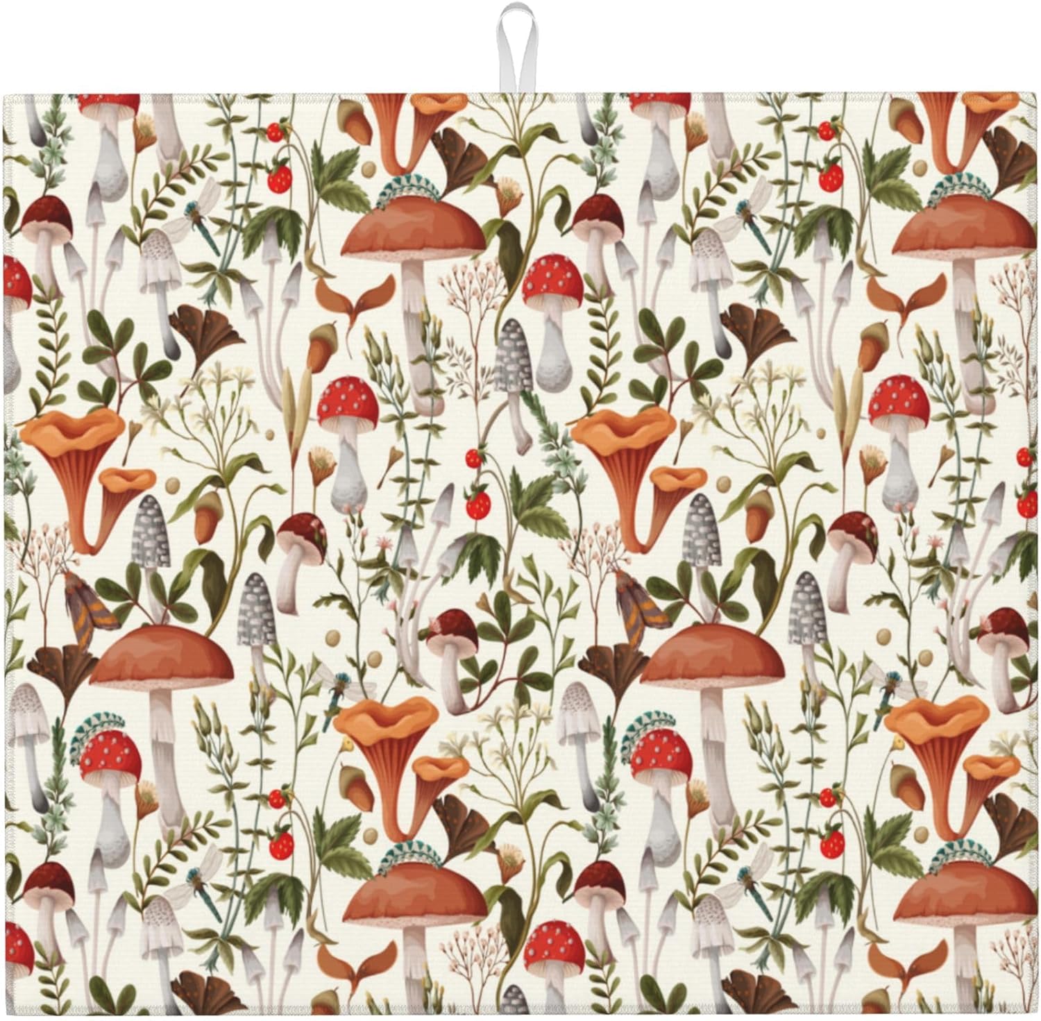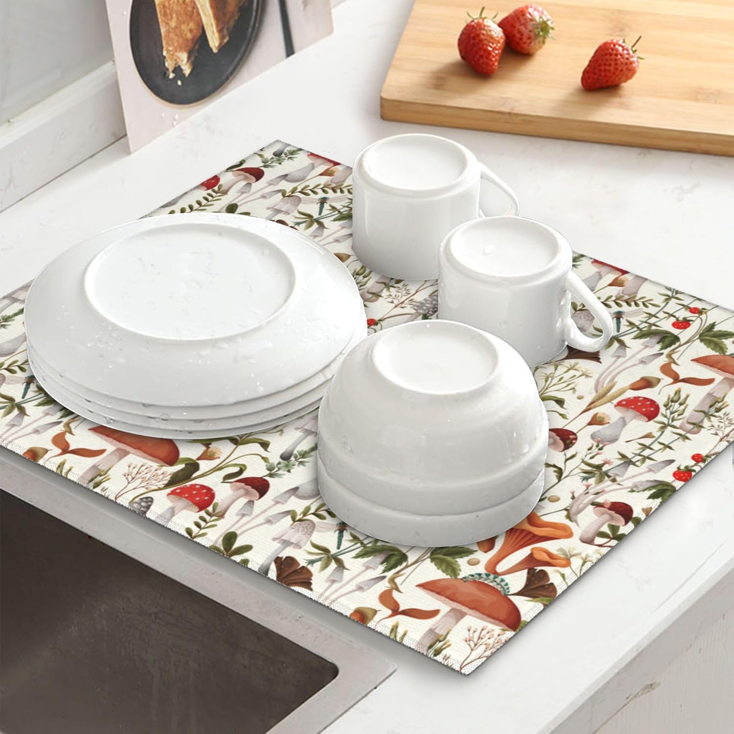Boho Mushroom Decor Dish Drying Mat for Kitchen Counter Botanic Plant Beige Dish Drainer Rack Mats 16x18 Inch Absorbent Reversible Drying Pad