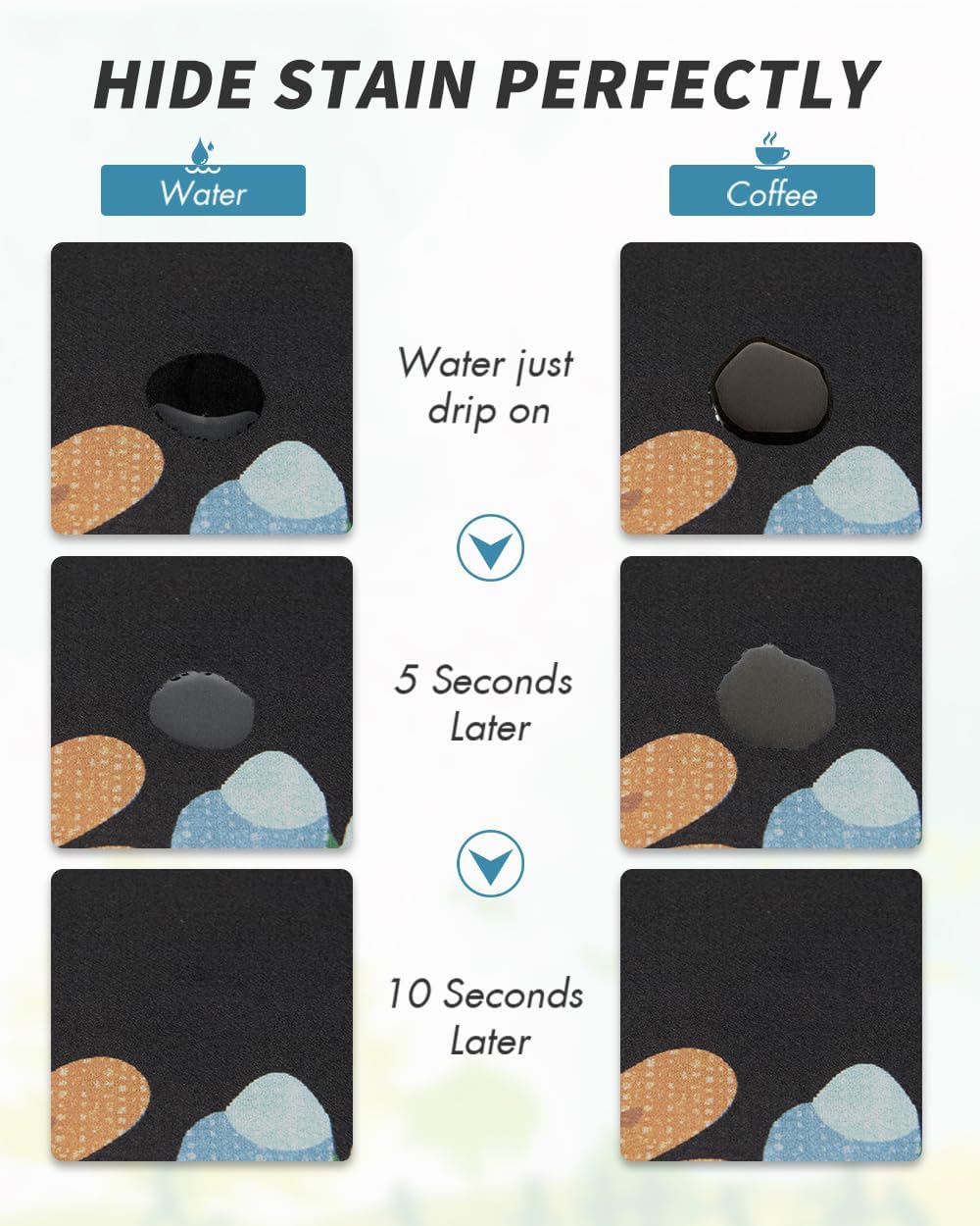 - NO WATER MARKS: special PU surface hide coffee stains, milk stains and any other dark messy stains well. Say goodbye to traditional coffee mat full of stains