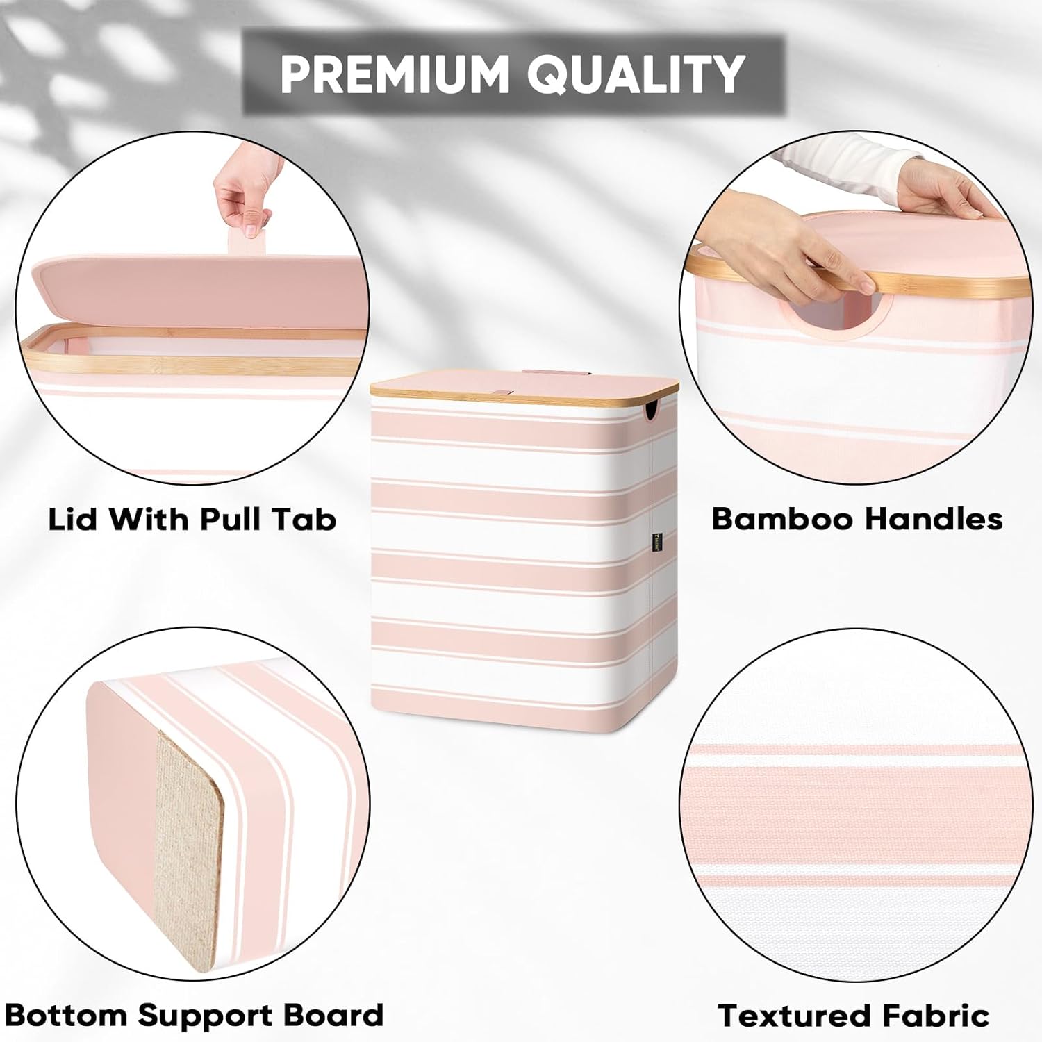 - [SLEEK DESIGN AND PREMIUM MATERIALS] Our laundry basket with lid adds a touch of elegance to any room. The natural bamboo rim gives it a timeless appeal, while the sturdy internal support structure ensures it maintains its shape, even when empty.