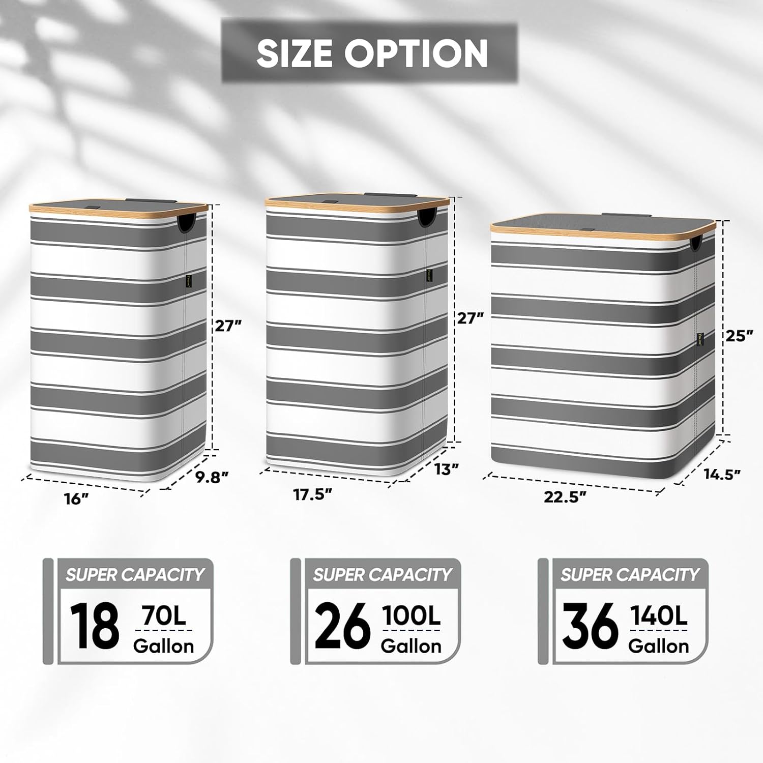 - [AMPLE CAPACITY AND EASY ACCESS] With 18 Gallon/26 Gallon/36 Gallon (70L/100 L/140 L) size option, the hampers for laundry provide ample capacity to hold all your dirty clothes, towels, bedding, and more. The lightweight lid is easy to open and close, providing quick and convenient access to your laundry.
