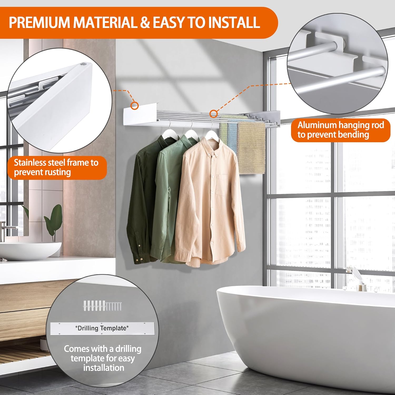 FOCHIER F Laundry Drying Rack Wall Mounted Clothes Drying Rack Collapsible with 4 Aluminum Rods and Drilling Template Long Screwdriver Bit 60 lbs Capacity (White, 23.6")