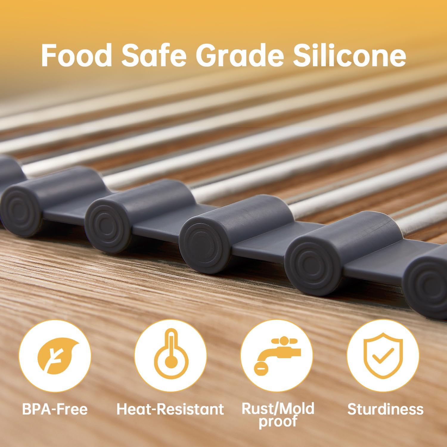 - Food Grade Material: The silicone roll-up dish drying rack is constructed from durable 304 stainless steel with BPA-free, food-safe silicone edges for safe use on fruits, veggies, cakes, etc.