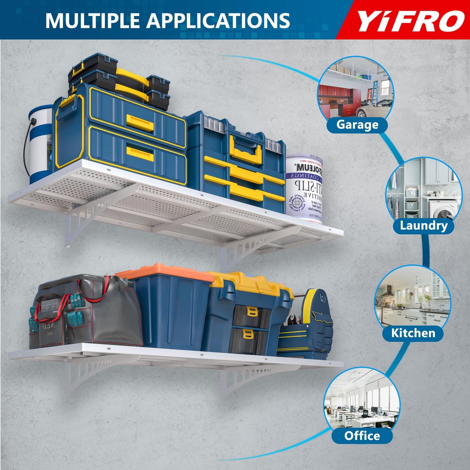 - ADJUSTABLE SPACING: YIFRO garage wall shelves is suitable for any wood post spacing, including standard 16'/18'/24'/32' spacing for installation.