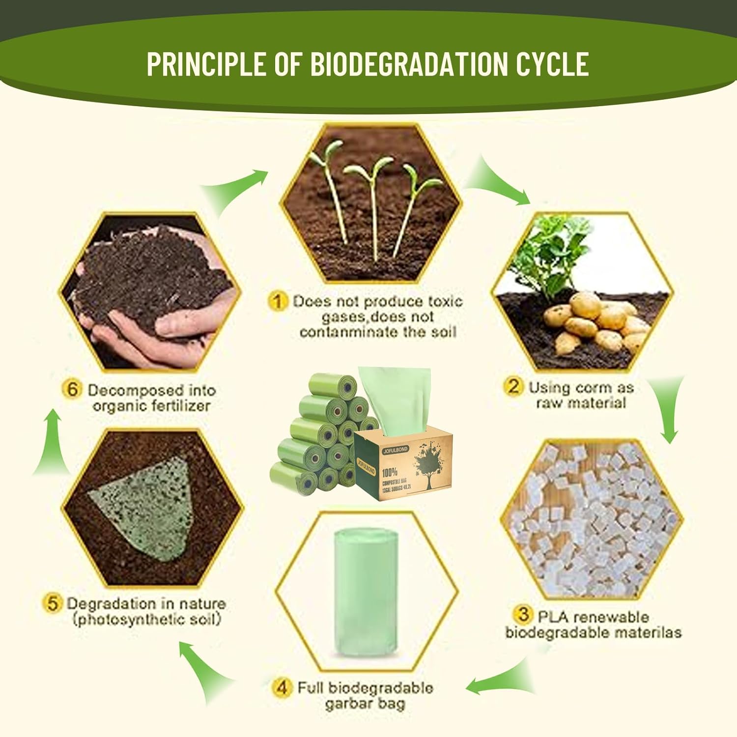 - JOFULBOND Advantages: Our large compost bags large than some kitchen garbage bags,which means prevents garbage can liners from slipping and more strong tougher,These biodegradable kitchen trash bags stretch and expand to accommodate oversized loads without punctures,leaks or tears.