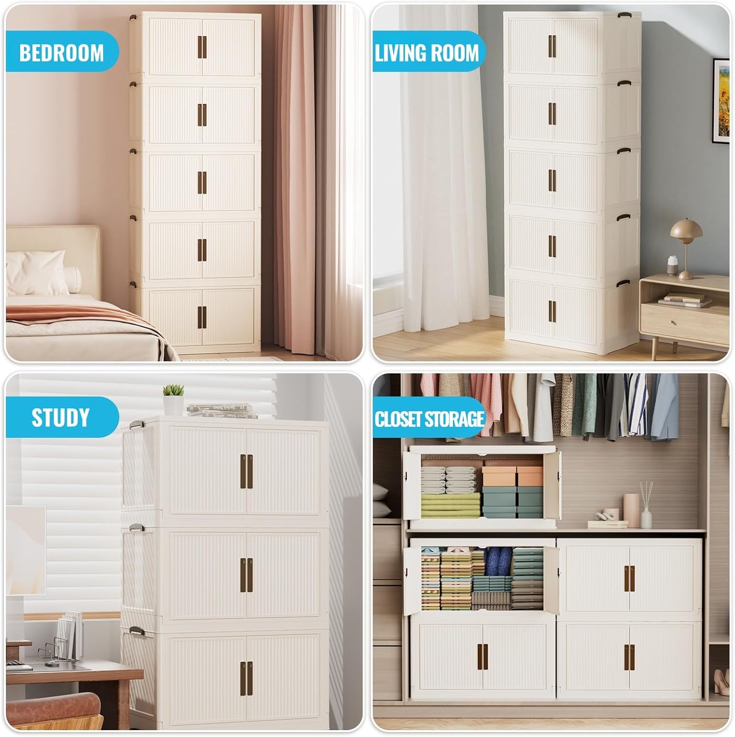 520QT/130GAL Stackable Storage Bins with 1 lid Storage Closet Organizers and Drawer Foldable Storage Bins Container with door Collapsible Storage Box for Home Office Dorm Room(104Qt X 5),White