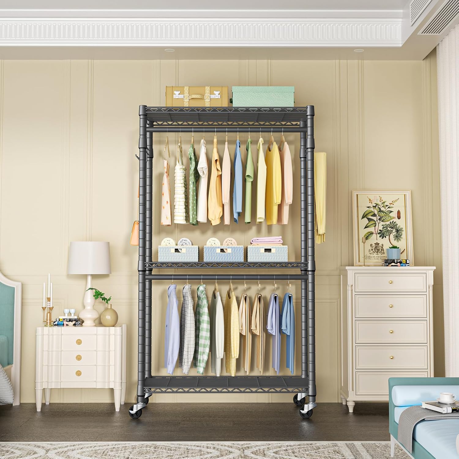 FUTASSI P1 Heavy Duty Garment Rack, 3 Tiers Adjustable Rolling Metal Closet Organizer with Lockable Wheels, FreeStanding Wardrobe with Double Hanger Rods & 1 Pair Hooks, Max Load 450 LBS, Gray