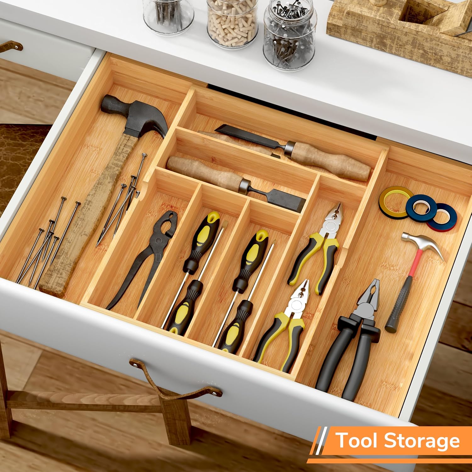 - High Quality Bamboo Material: The bamboo drawer organizer is made from high quality natural bamboo, which has a fine texture, smooth surface and warm feel; Bamboo is renewable, fast-growing, sustainable, and structurally sturdy, ensuring that the organizer will stand up to daily use and maintain its shape over time