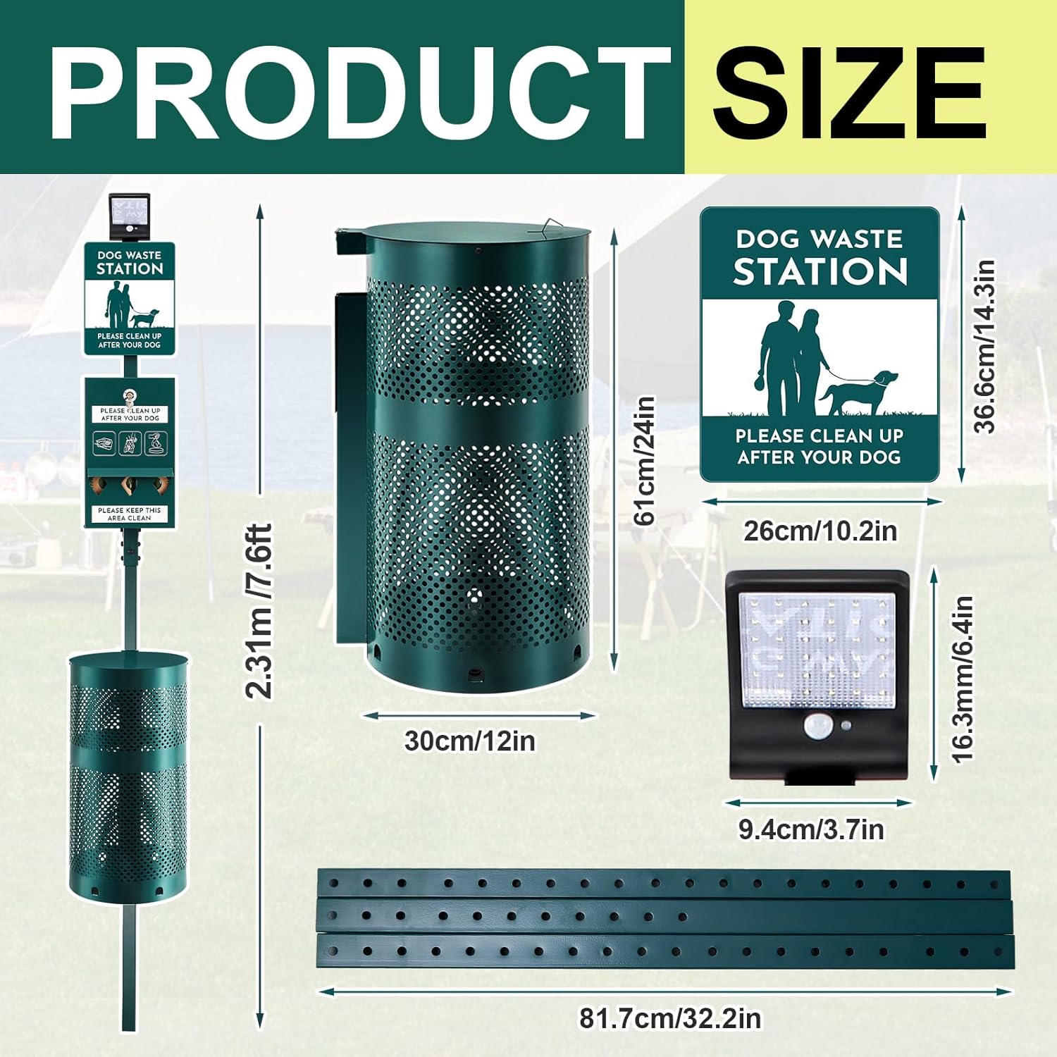 - For your convenience: This galvanized steel outdoor pet waste bin with poop bag dispenser saves you the hassle of purchasing different elements separately; All necessary screws and tools are included in the package, making it a one-stop convenient solution for your pet waste management needs. In addition, this dog waste station comes with a solar panel to provide you with light in the dark, making it convenient for you to clean up the waste at night