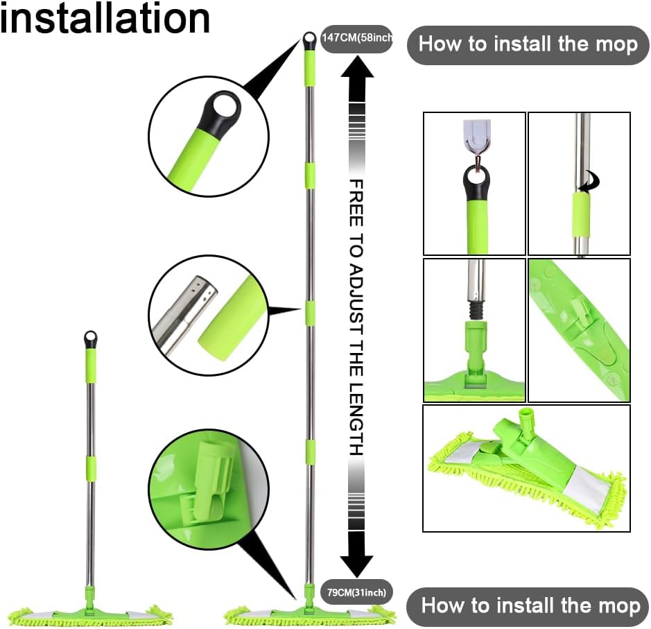 - the 4 holes on the flat mop head:Dust mop can not only work with the provided chenille pads, it is also compatible with disposable cleaning cloth, wipes, towels, rags and old clothes due. You only need to push it into the holes to keep it in place. Specially designed for people who don't like washing mop pads. You can toss away the disposable cloth directly after use. And your old clothes and rags will be fully utilized.