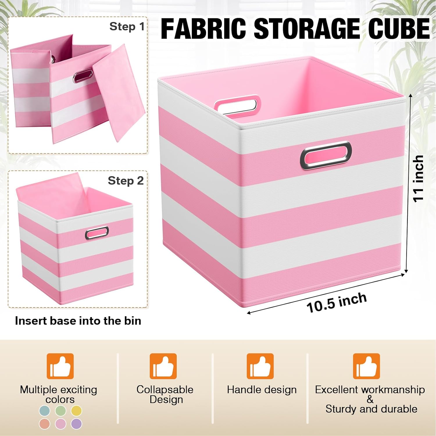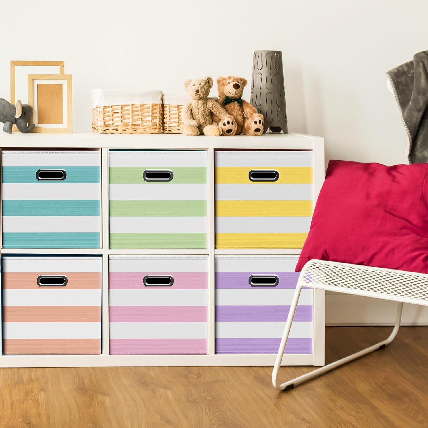 - Macaron color: elevate your organization with a touch of pastel perfection. Our set of 6 macaron-colored fabric storage cubes comes in an array of delightful hues: sky blue, light pink, yellow, pink, lavender purple, and emerald green. Each bin measures 10½"L x 10½"W x 11"H, perfectly sized to slot into your existing shelves or cabinets, adding a splash of color while keeping your space tidy