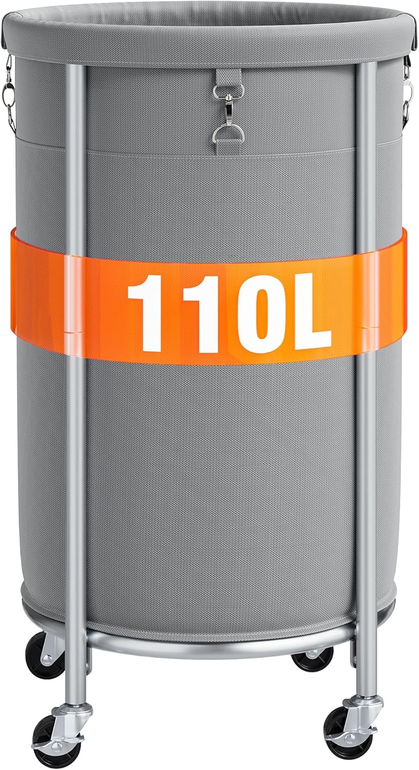 ELYKEN Laundry Hamper with Wheels, 110L Rolling Laundry Basket, Round Laundry Cart with Steel Frame and Removable Bag, 4 Casters and 2 Brakes, Dirty Clothes Hamper for Hotel, Home, Closet, Dorm, Gray