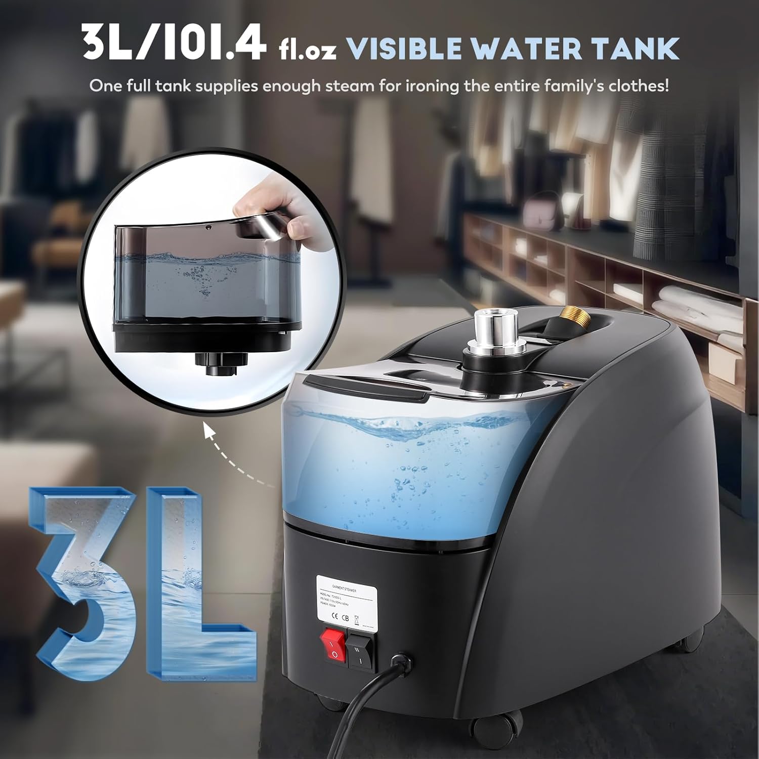 - [Detachable Water Tank]: With a large capacity of 108 fl.oz detachable water tank allows you 70 mins steam time per filling to iron commercial use or an entire family's wardrobe in one fill. The semi-transparent design makes it easy to read the remaining water level.