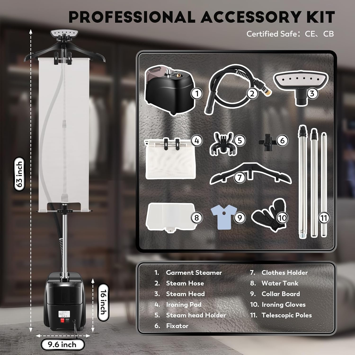 - [Complete Set of Accessories]: All included accessories are CE and CB certified, meeting professional standards and passing safety and quality tests. The set comes with an ironing cloth, clothes hanger, ironing pad, gloves, trouser clips, and a collar board to cater to all your ironing needs.