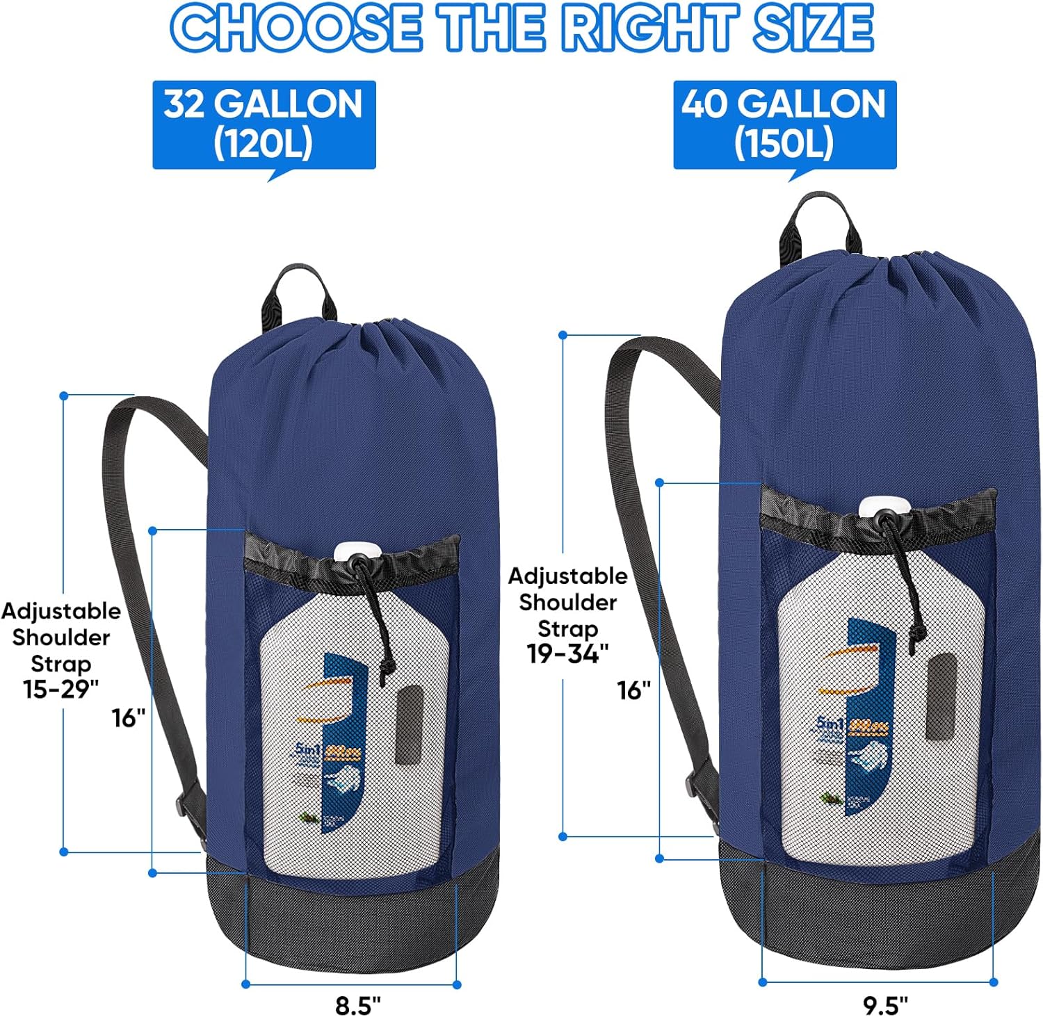 - 120L Large Laundry Bag: These travel laundry bags measure 29 "H X 13 "L with a large capacity of up to 120 L, enough for holding 2-3 batches of clothes; They also feature two front mesh wash pockets (16 "H X 8.5"L each), making your laundry backpack have space for storing detergent, shoes, and other essentials