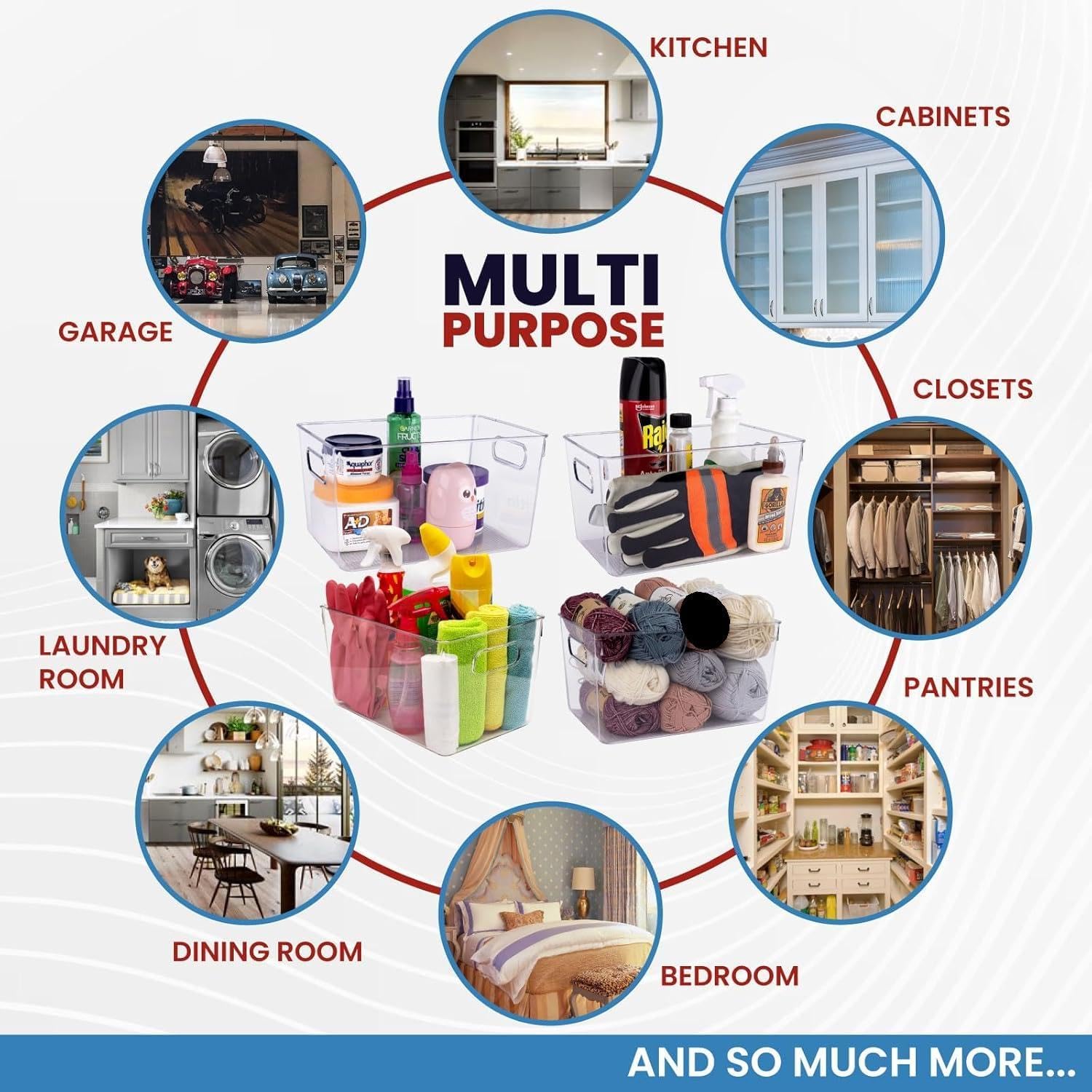 - YOU WON'T FIND A MORE VERSATILE SET OF BINS: You can use these large clear plastic storage containers with lids for organizing any space in and around your home – the kitchen, cabinets, closets, pantries, bedroom, dining room, laundry room, nursery, garage, kids toy room, under sink organizers and more.