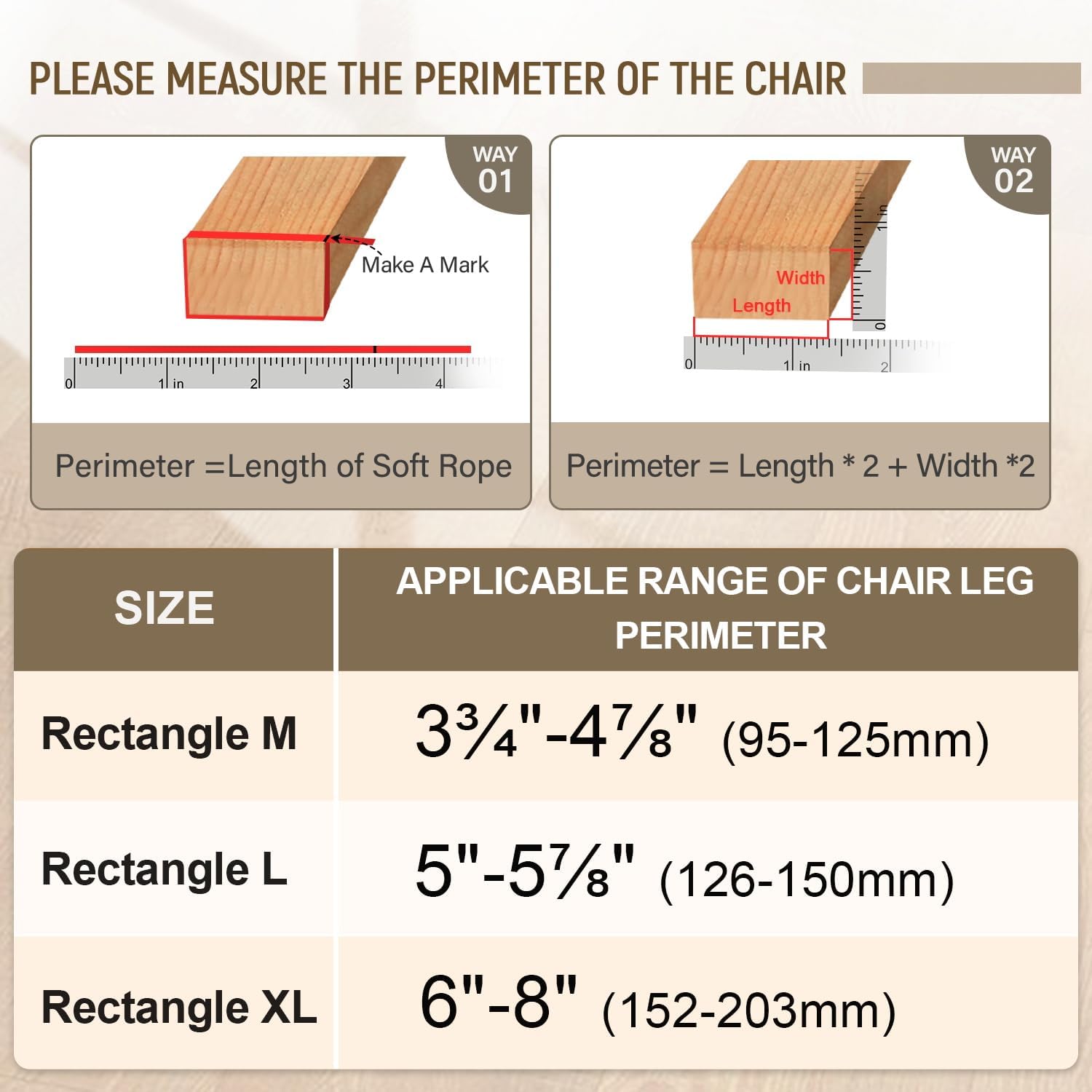 - Size application: They fit snugly on different chair legs. Measure the side length and pick the size that matches: M(Perimeter: 3-3/4"~4-7/8")、L(Perimeter: 5"~5-7/8")、XL(Perimeter: 6"~8").