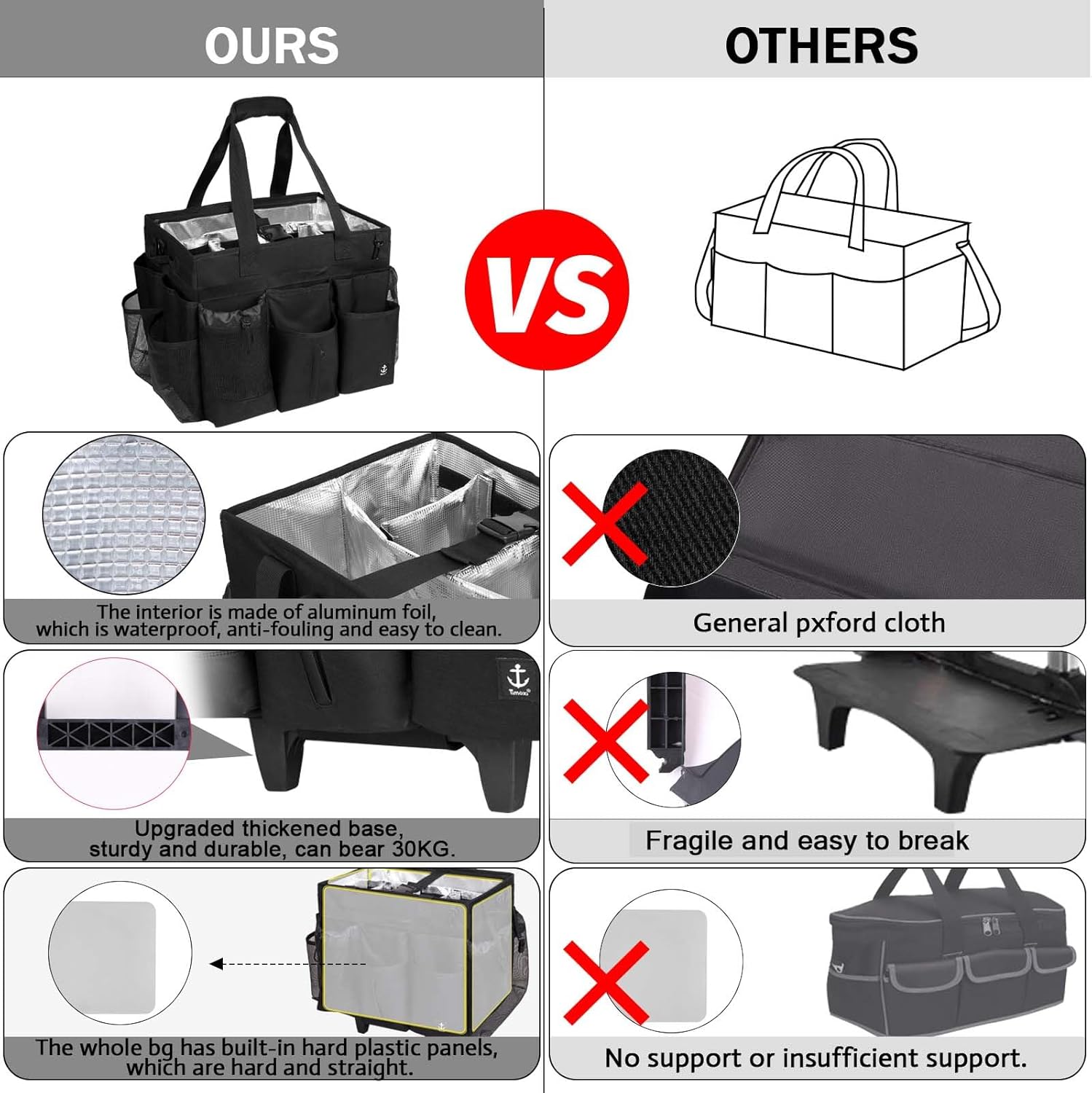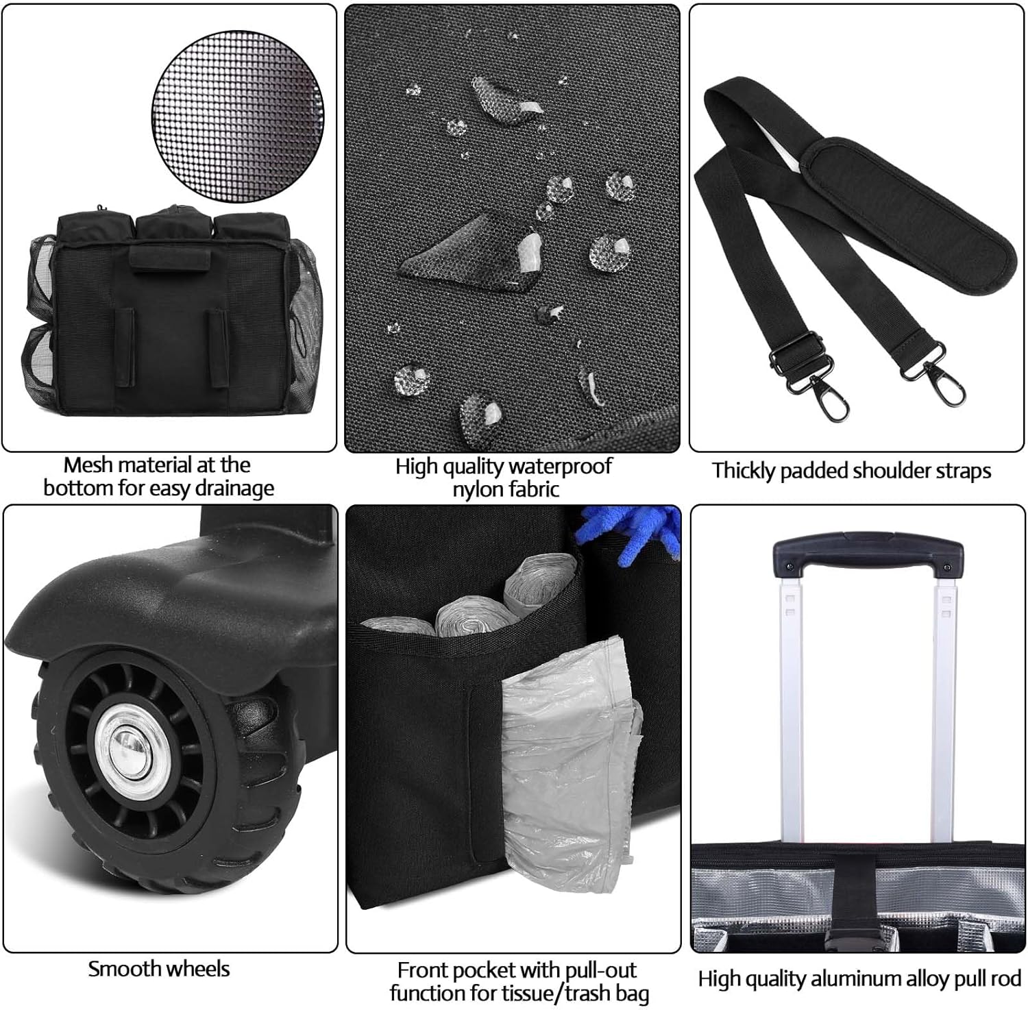 - Premium Quality Material: The Timoxi rolling cleaning caddy is made from high-quality nylon that is both waterproof and abrasion-resistant. The lining is made of aluminum foil, which is waterproof and easy to clean, and is very suitable for storing all kinds of cleaning agents.All four sides including the bottom are supported by 2mm hard plastic plates, which can bear a load of up to 30KG, so it is very sturdy even when the bag is empty. The size of the cleaning bag is 15.7''*11''*13''.