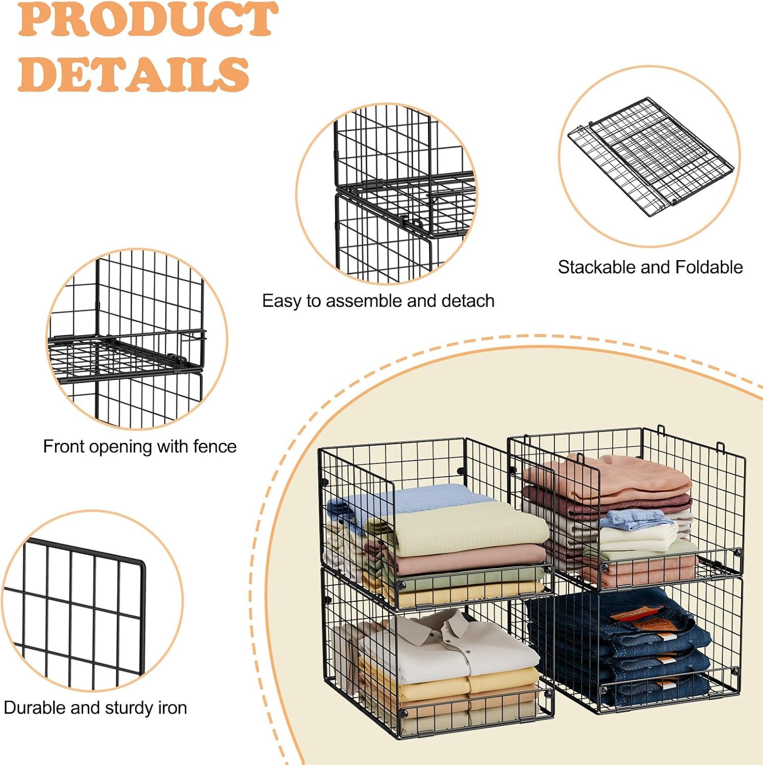 - 【Sturdy Iron Mesh】Made of premium iron mesh,these closet storage bins are sturdy,durable,breathable,visible,no smell and washable.Would not bend or damage like plastic or cloth storage baskets. You can count on it is strong enough and has a good craft.