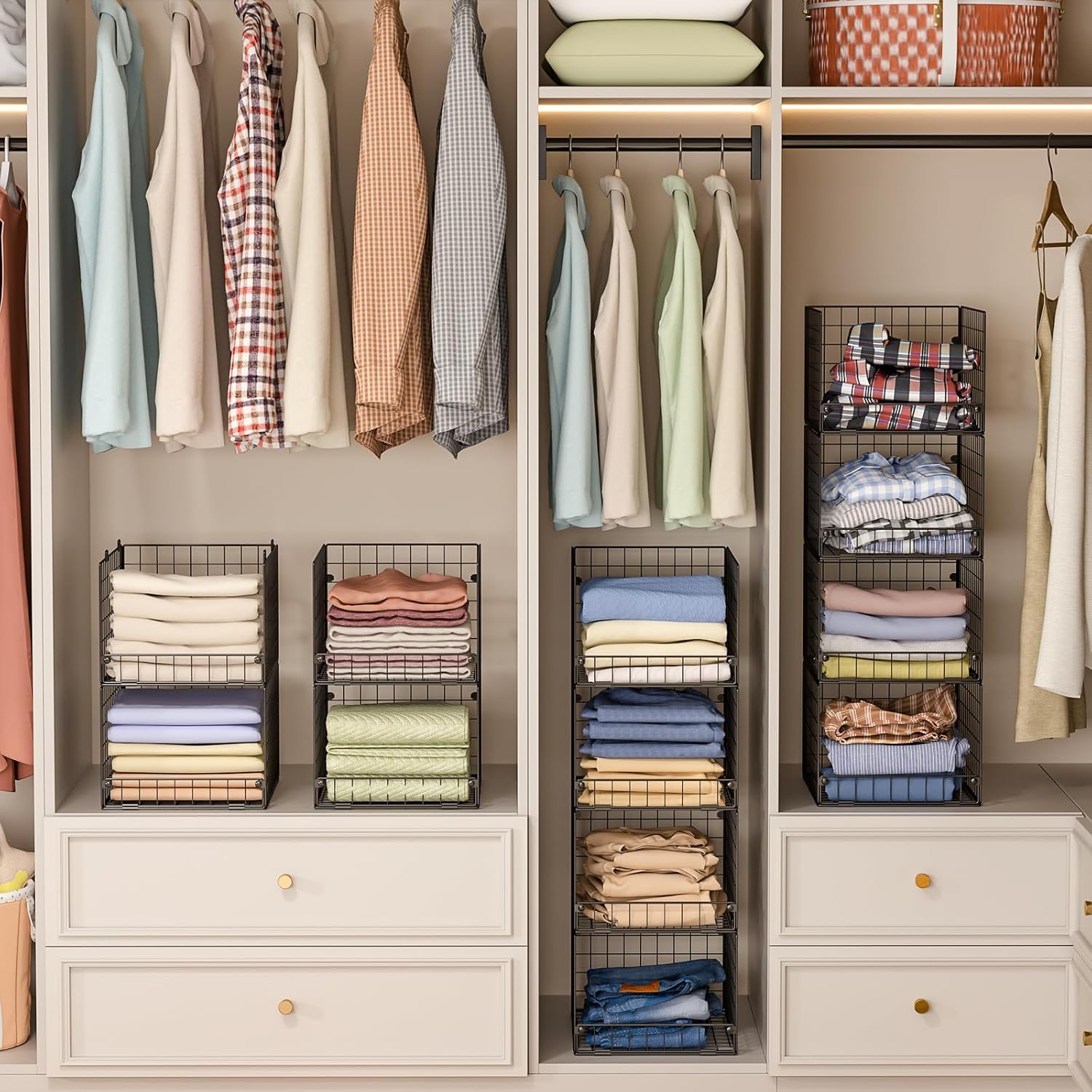- 【Stackabe and Foldable】These collapsible closet shelves organizer are stackable and foldable.And can fold them to put in a corner without taking up space.You can stack multiple units together or use only one to meet your different needs.