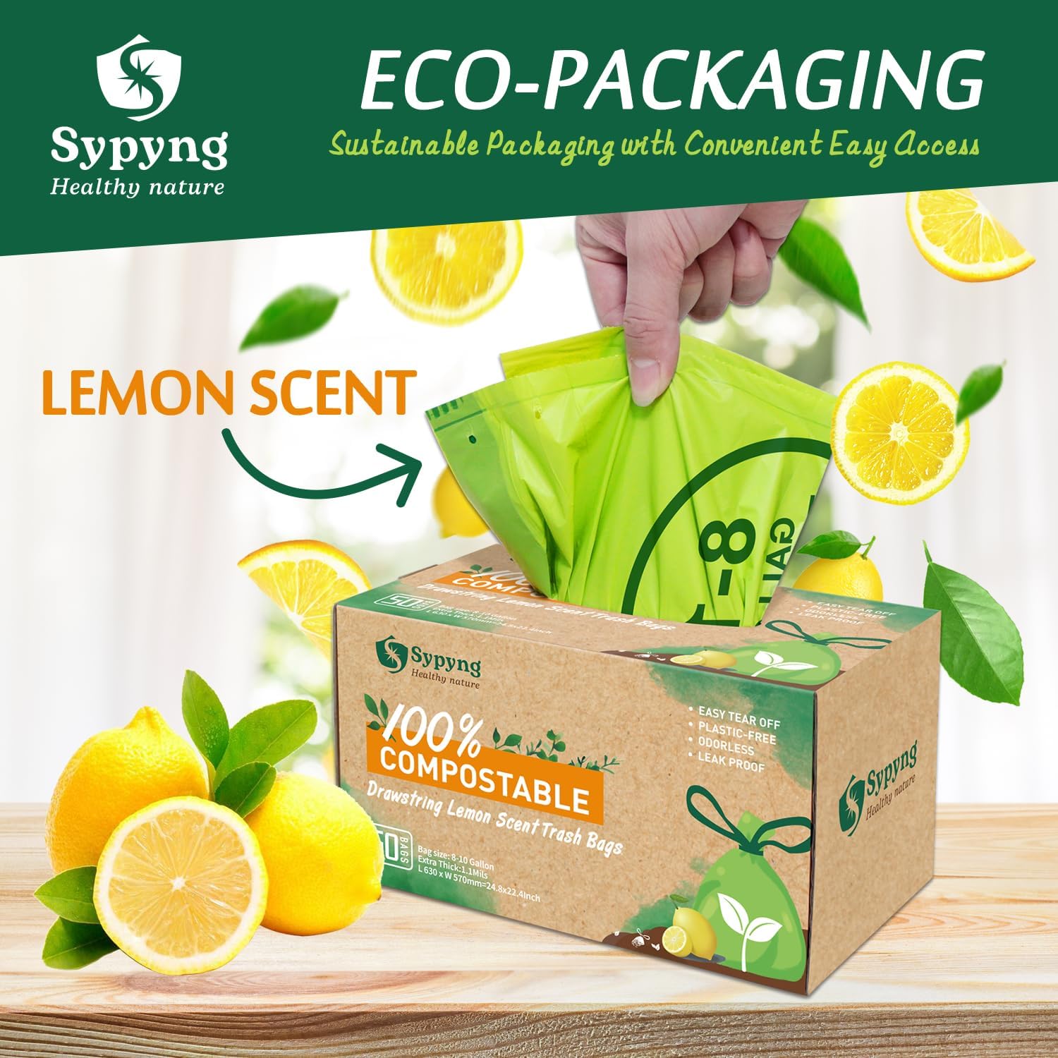 - COMPOSTABLE TRASH BAGS – Made from eco-friendly materials, our 8–10 gallon bags are 100% biodegradable and compostable. Lightly lemon-scented for a fresh, clean smell, they’re perfect for kitchen scraps, garden waste, and office trash. Certified to meet ASTM D6400 and OK Compost HOME standards, these bags break down naturally in your home compost bin—providing a convenient and responsible alternative to plastic bags.
