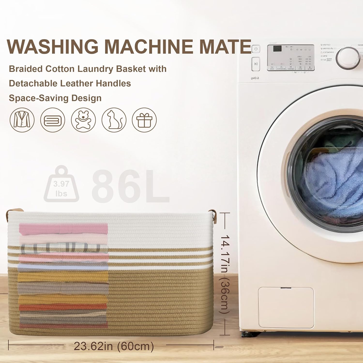 86L Extra Large Laundry Basket with Leather Handles for Living Room Storage, Woven Rope Baskets for Blanket, Kids Toy, Gifts, Wicker Hamper for Bedroom Dirty Clothes, 24"x16"x14" Khaki