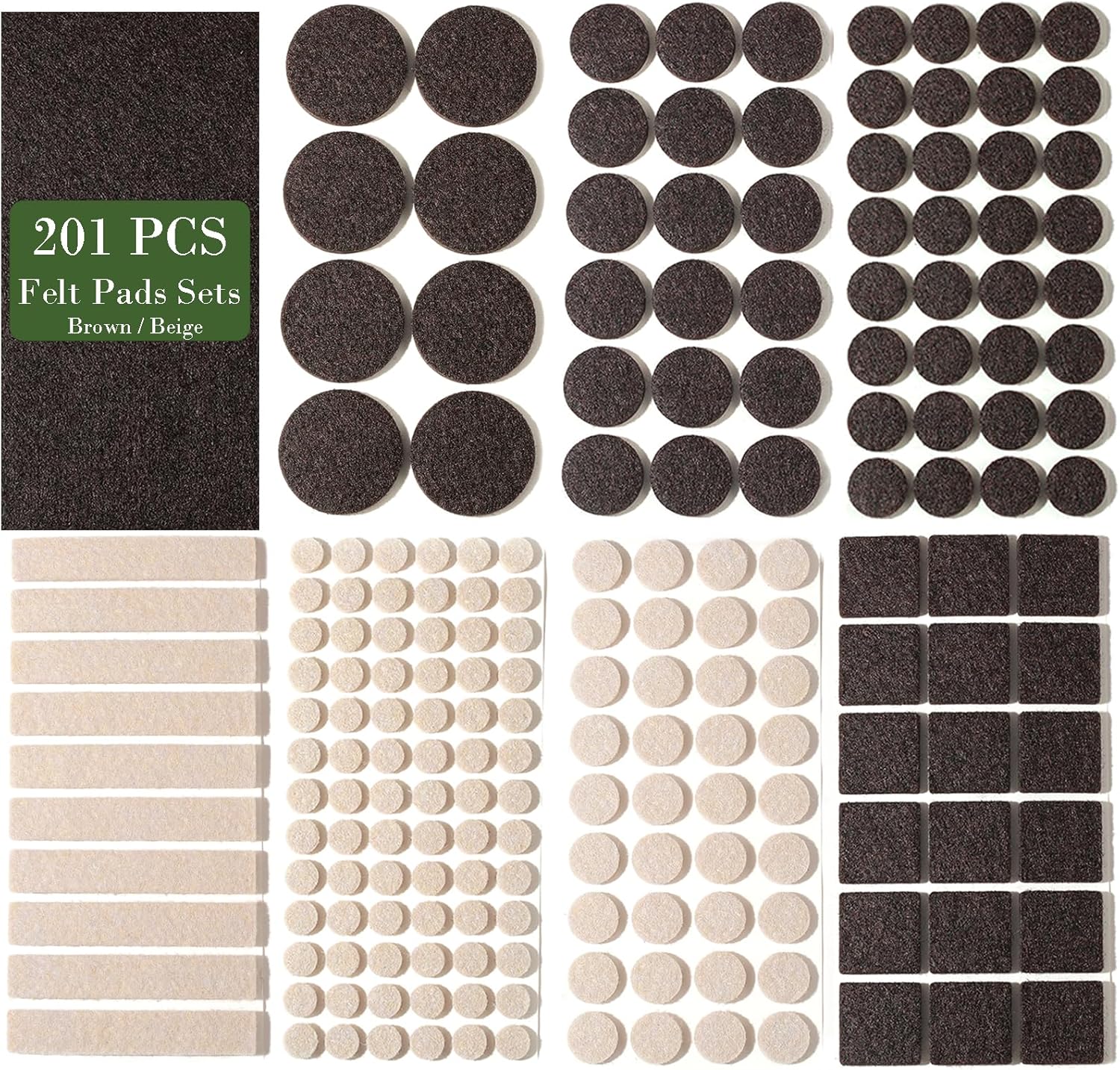 - 201 Pcs Felt Furniture Pads Includes: Round Felt Pads: (8) 1.57", (18) 1", (32) ¾", (78) 3/8", (36) 5/8", Strip Felt Pads: (10) 3"x1/2", Square Felt Pads: (1) 6.6×3.3", (18) 1×1", All sizes can be trimmed for use on different furniture legs.