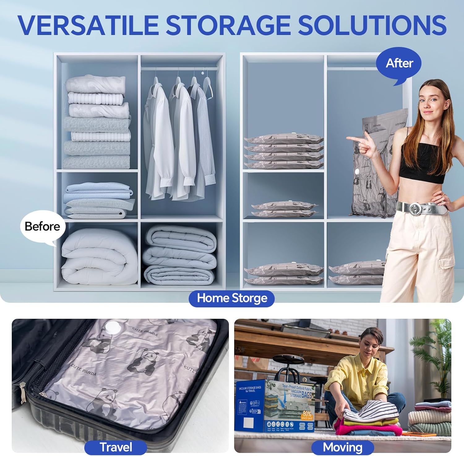 - VERSATILE STORAGE SOLUTION: All different sizes for your needs. Space saver vacuum storage bag helps you save space in luggage, or closets by compressing clothes, bulky bedding, blankets, pillows and more. A practical and effective way to maximize storage space for travel, home use,dorm room essentials, travel essentials, moving