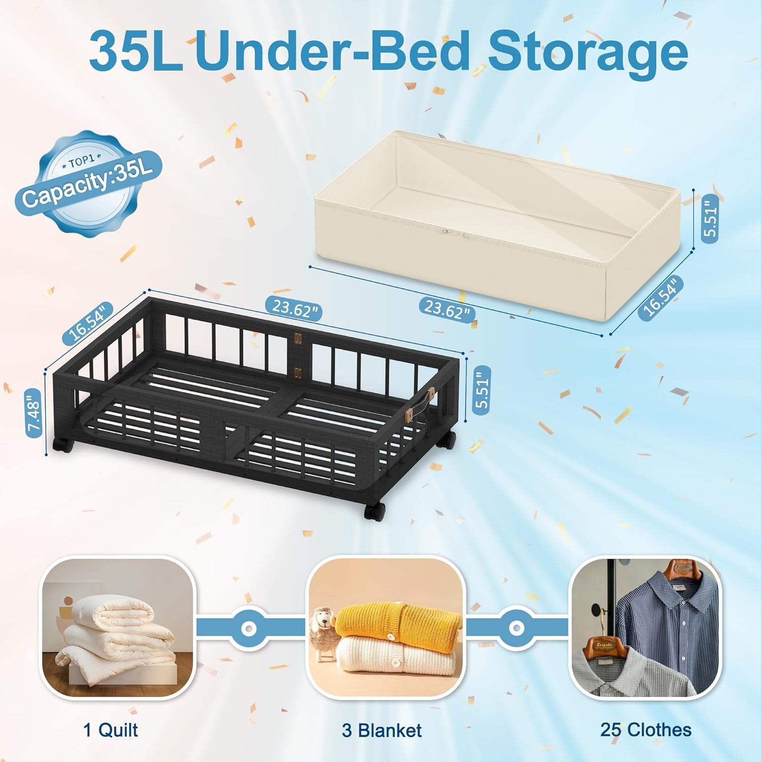 - 【Bamboo Under Bed Storage】 The sturdy and durable under-bed storage is made from 100% bamboo. With dimensions of 23.6''L x 16.54''W x 7.5''H (Includes wheels). It is designed to underutilized spacess (under the bed & safa), helping to keep your home tidy and organized