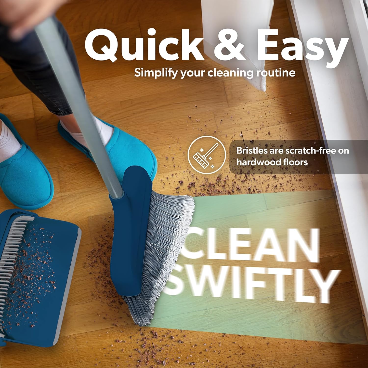 - Self Cleaning Comb Design - Sturdy teeth at the top of the dustpan comb the broom, when it collects hair/dust/lint which usually gets tangled into the bristles. Otherwise, you would need to remove them manually - not the most pleasant experience. The dustpan has a rubber lip and seamlessly sticks to the floor. It picks up everything, including the smallest particles, in the first swoop, so you will finally spend less time cleaning - more time living!