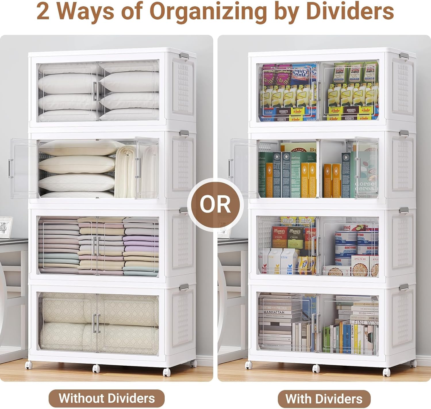 - 【Extra-Large Storage Bins With Dividers】BROVIEW storage bins offer an astonishing capacity of 200Qt/50Gal per tier. 4Pack foldable storage bin, equipped with doors and wheels, expands to generous dimensions of 33.5"L x 19"W x 69.3"H, can support a maxi weight of 120lb. Each tier is designed with a divider (can be rearranged or removed, removed it will reduce load-bearing capacity), you can create two distinct compartments within a single level for organized storage. (Note: 1 Set ONLY 1 LID!)