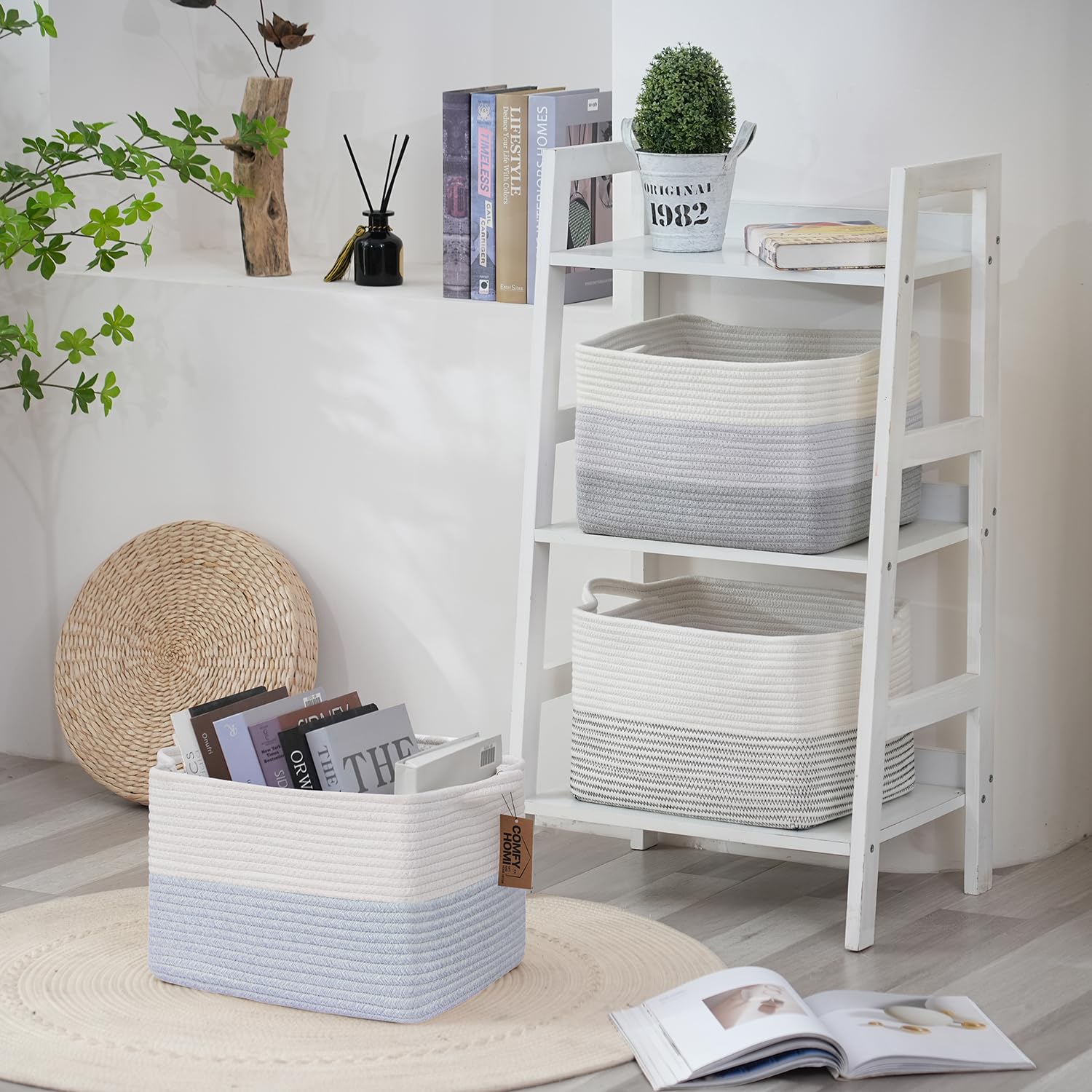 COMFY-HOMI 3PACK Cotton Rope Square Baske with Handles for Shelves|Dog Toy Baske Bin and Storage|Baby Baske for Gift|Shoe Baske for Organizing|13.5" x 11" x 9.5" for Living Room(White/Blue)