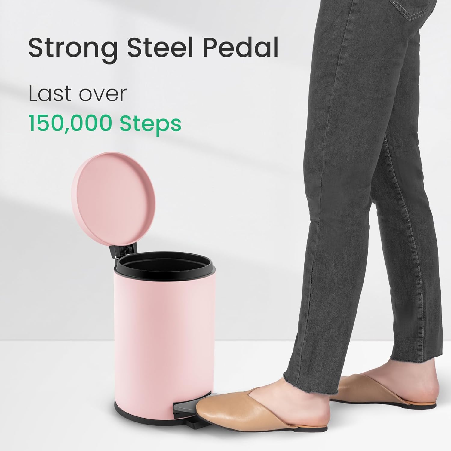 - Quality Construction: The trashcan is crafted from sturdy stainless steel. And the strong steel pedal is built to withstand over 100,000 steps — that's more than 20 steps a day for 20 years