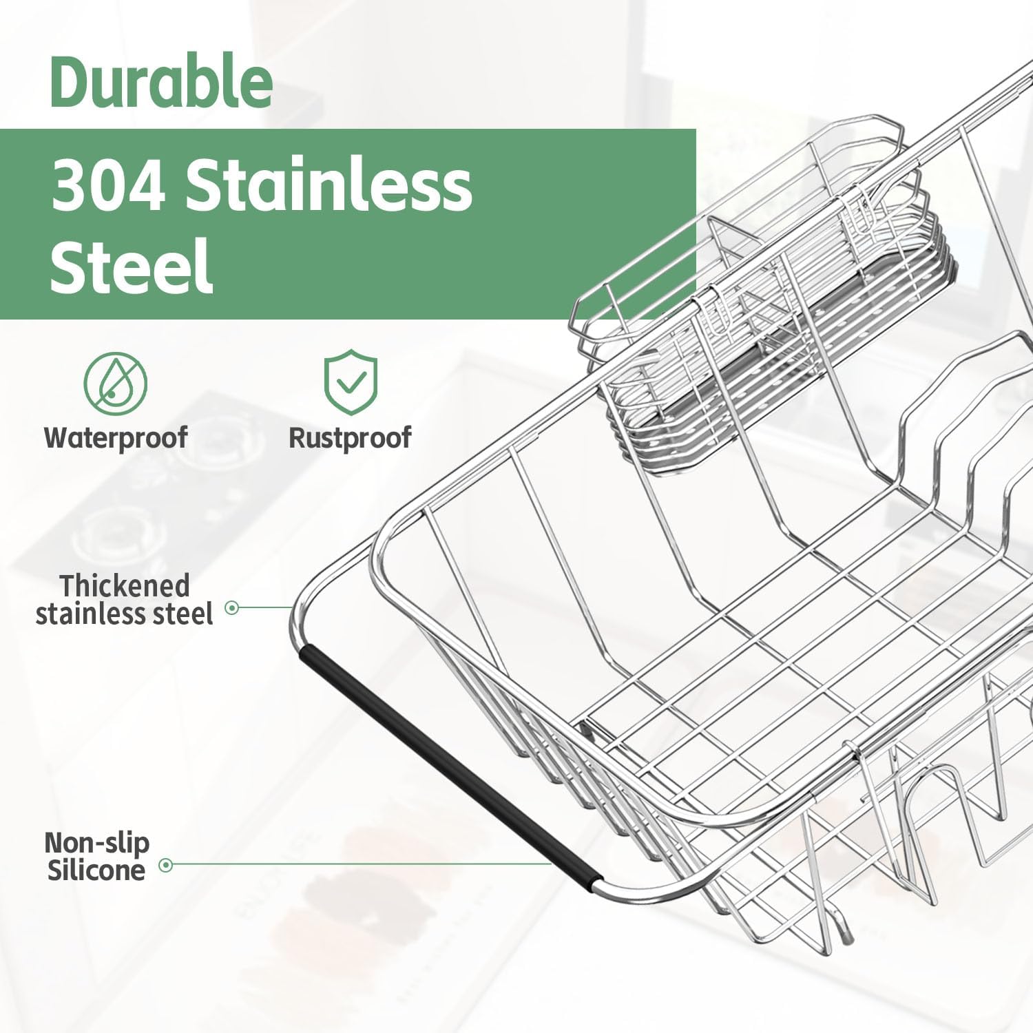 Dish Drying Rack in Sink, Extendable Stainless Steel Dish Drainers for Kitchen Counter, Anti-Rust Dish Dryer Rack with Utensil & Cup Holders, for Inside Sink, Over The Sink