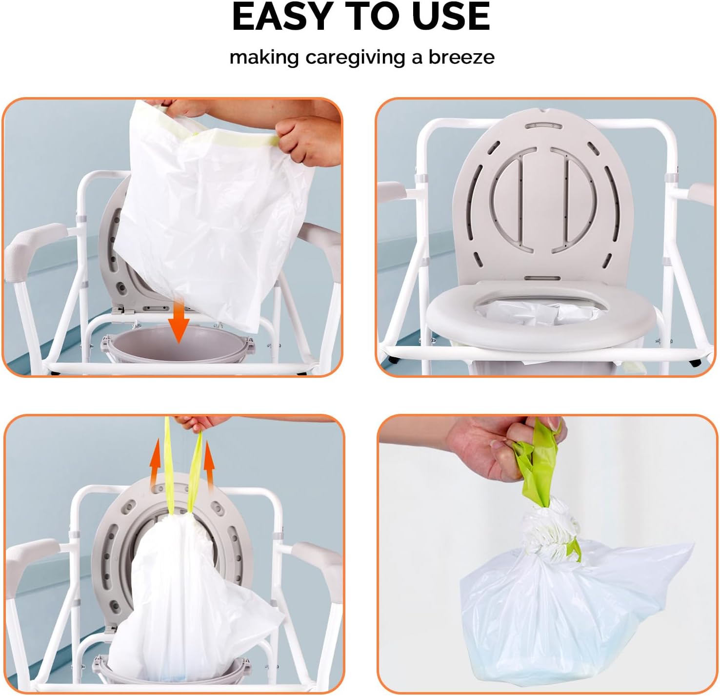 - Hands-Free Liberation: Not only do they significantly reduce the time spent cleaning the bedside commode, but more importantly, by using bedside commode liners, you can free yourself from tedious cleaning tasks, effortlessly enjoying the pleasures of life, making caregiving a breeze