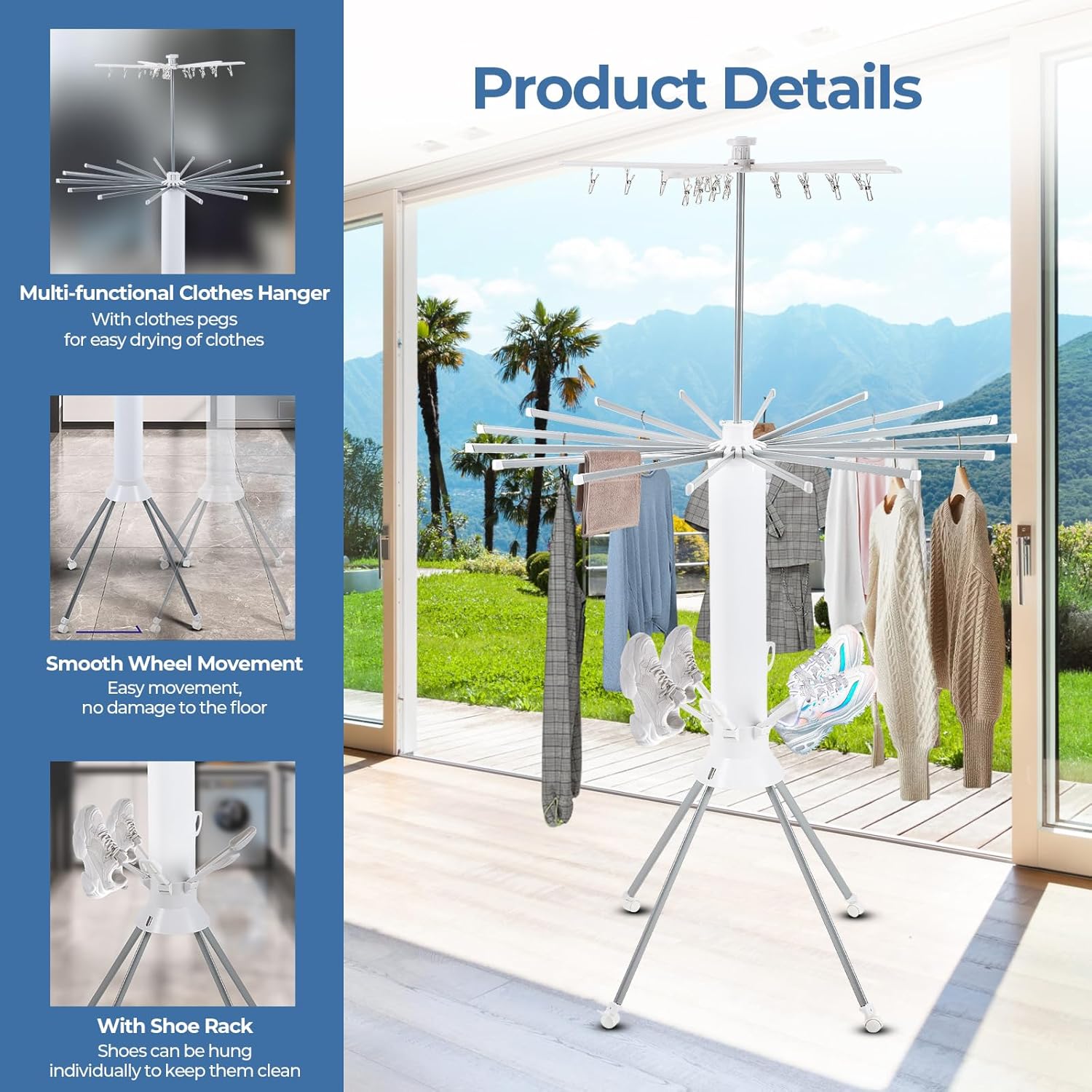 - 【Mobility and Safety Features】Equipped with four movable casters and a foot brake system, this portable clothes drying rack can be easily moved and secured in place. Ground stakes add additional stability, ensuring the drying rack remains safe during unexpected gusts of wind.