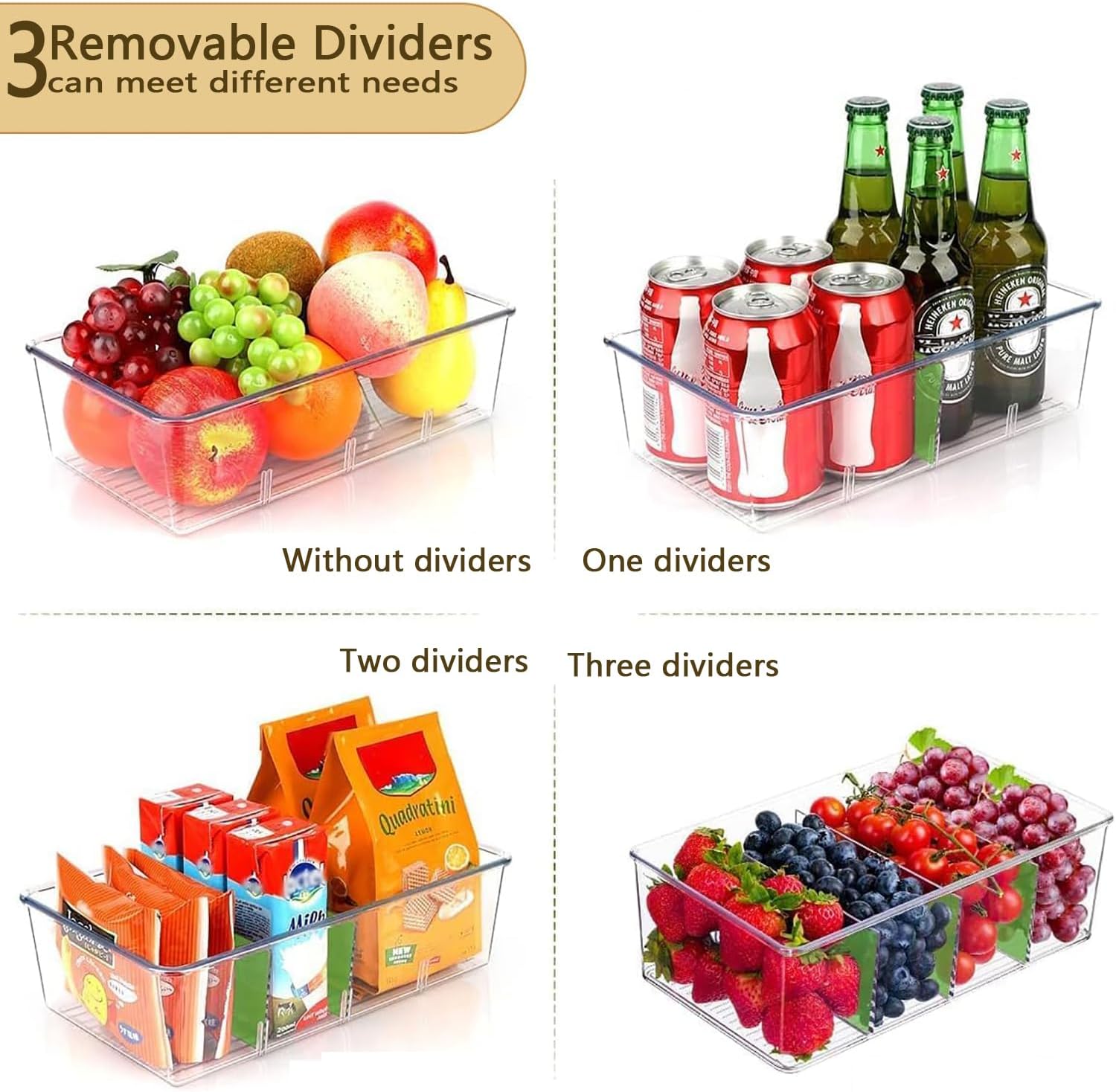 - Make Storage & Organizer To Easy - This divided bin with removable dividers is great for creating a clean and organized refrigerator or pantry.our Clear Plastic Storage Organizer Bins will be a great choice for you,They are perfect for organizing snacks,spice,seasoning,Tea,coffee packets.