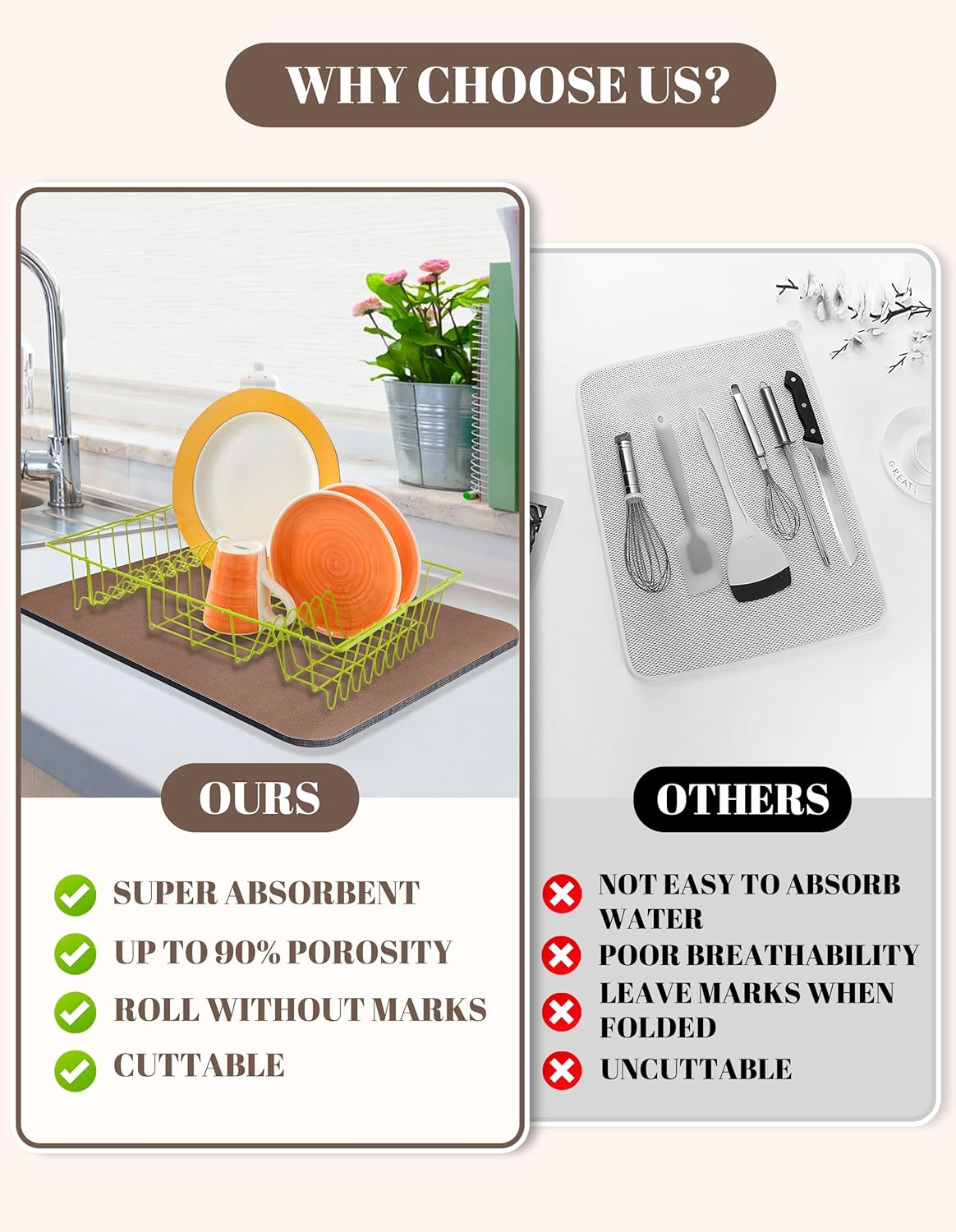 - Super Absorbent: Dish Drying Pad is made of super absorbent nano, the drying pad is soft and highly absorbent, which can dry quickly. In addition, the drying mat is thick enough to better protect countertops, tableware, and glassware from damage and contamination.