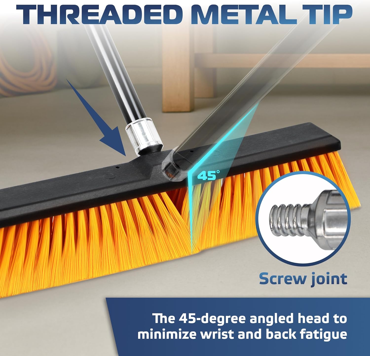 - ✅ 6 Row Stiff Bristles: The heavy duty broom has six rows of hard bristles that reach into all hard-to-reach places and remove the dirt. The bristles are strong, do not fall out and are wear-resistant for a long time. The industrial broom features a 45° angled head to effortlessly reach corners and tight spaces.
