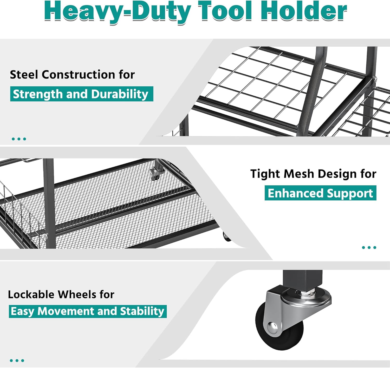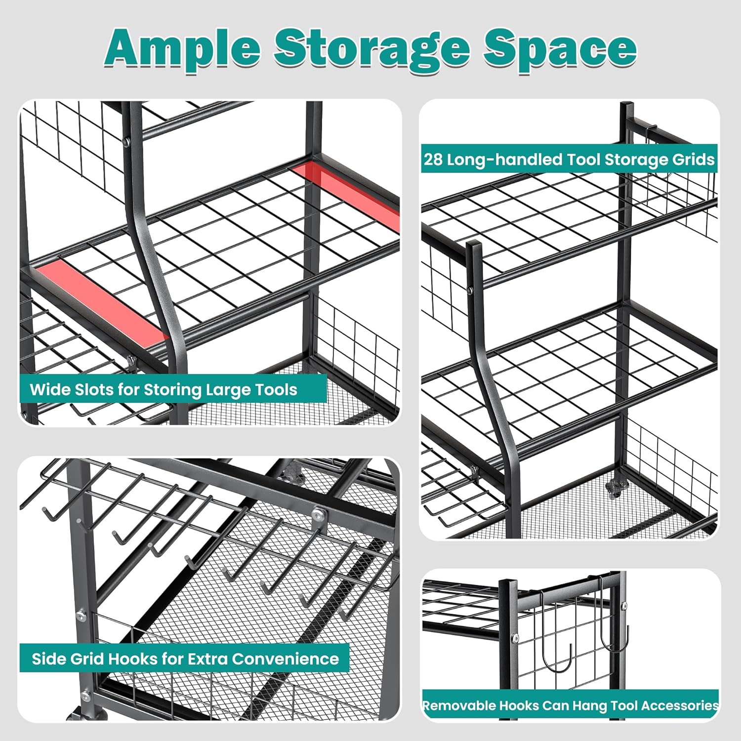 • Flexible Movement & Locking: Equipped with four heavy-duty wheels, this garden tool stand moves easily on uneven ground or grass. Two wheels feature a locking function to secure the rack in place when needed