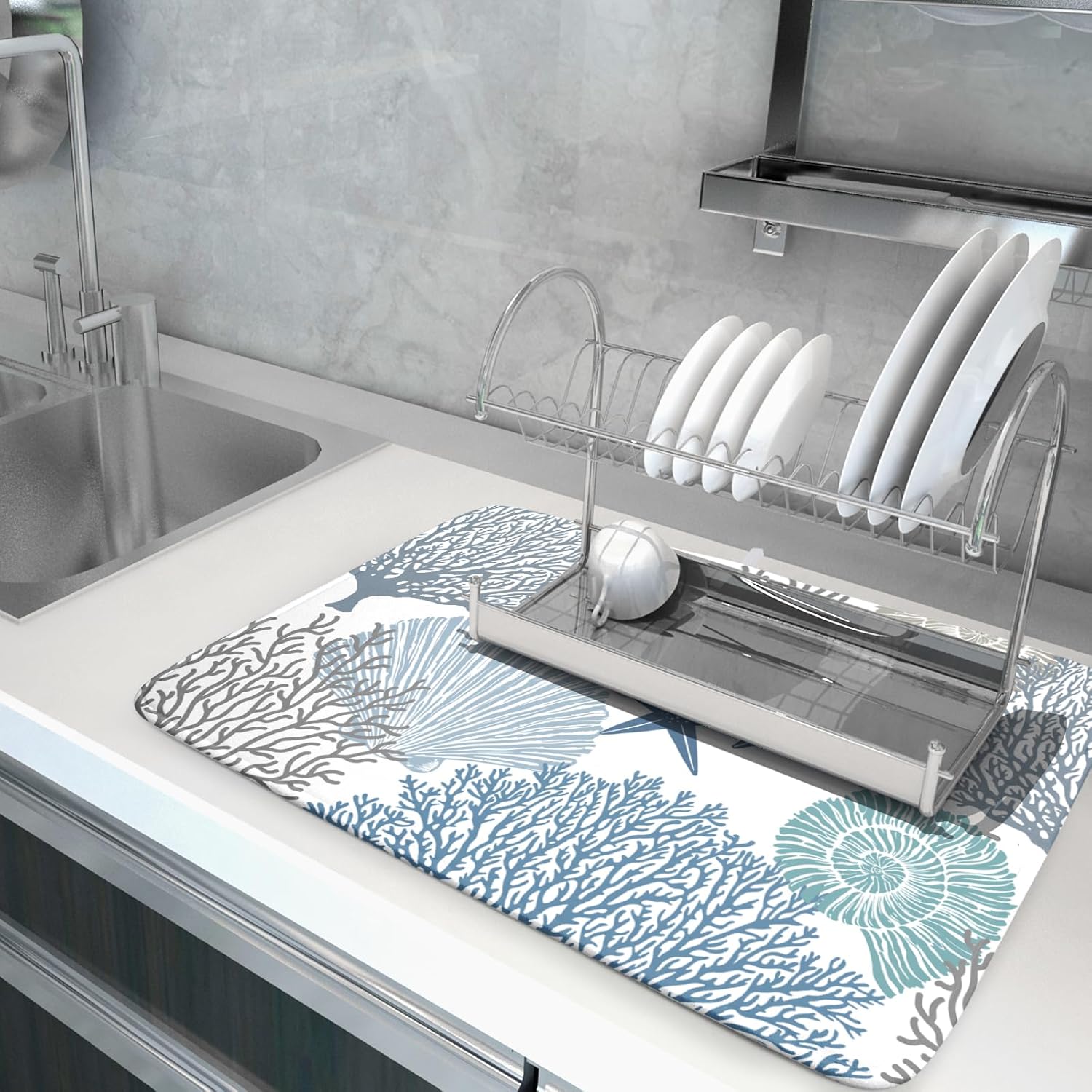 • 【Fashion Design】Our Summer sea dish drying mat is customized with single-sided printing, one side is takes Summer ocean as theme, printed with design blue sea shell and starfish pattern, does not fade, perfect functional addition to your kitchen decor, fitting well and tightly on most counters. Prepare the best holiday present for family and friend, housewarming parties, weddings, birthdays, Easter day and Spring.