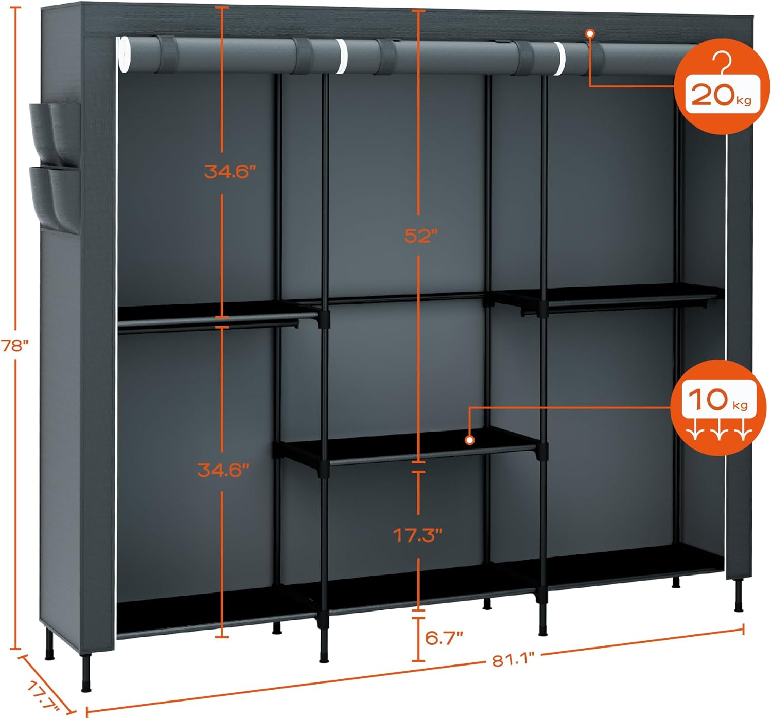 - [Stable and Strong] Featuring with steel tubing, high quality non-woven fabric and durable connectors, this wardrobe ensures long-lasting stability and support. Each hanging rod holds 44 lb and Each shelf holds up to 22 lb.