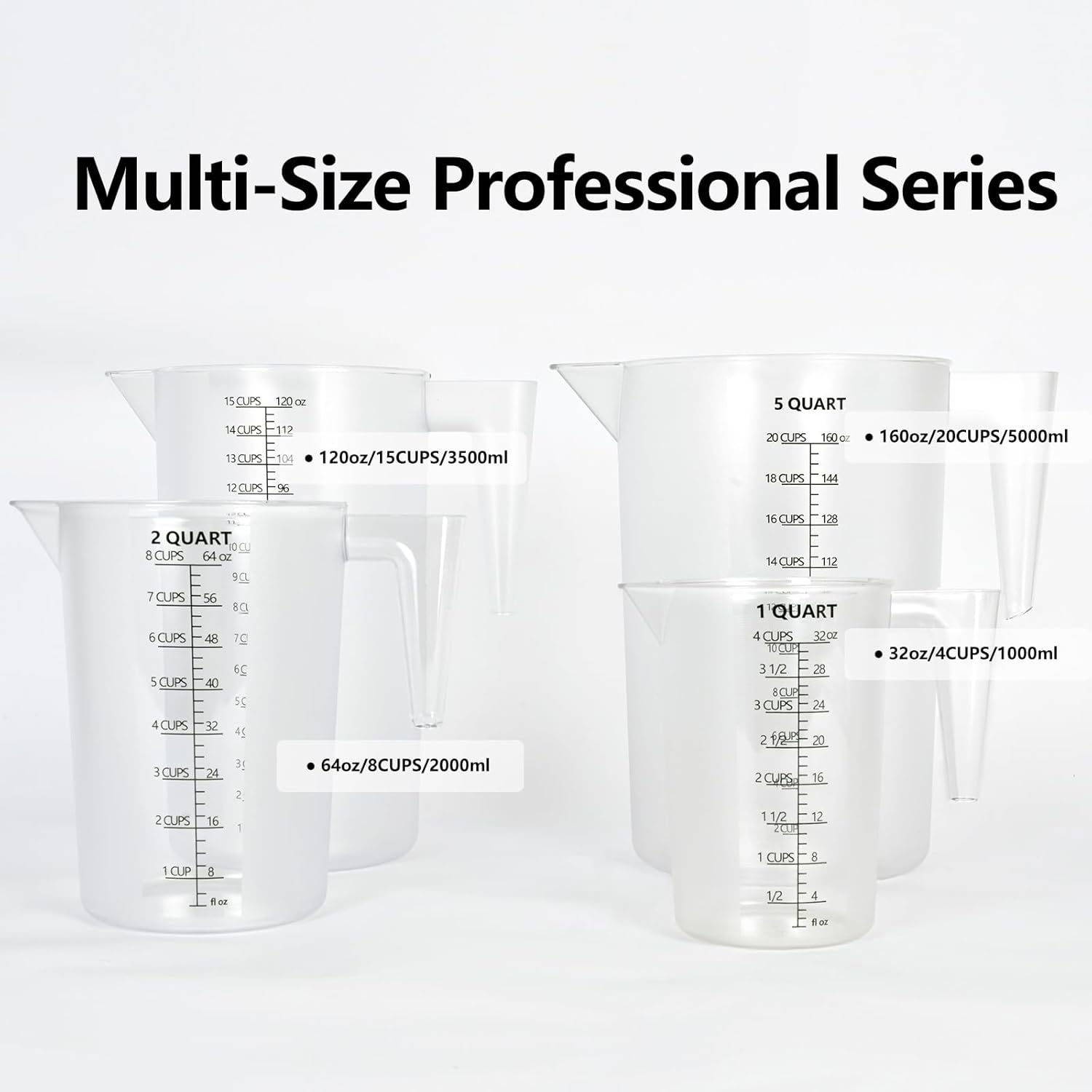- Choose your ideal plastic measuring pitcher in 4 sizes: 32oz (1000ml/4cup) Measuring Pitcher: Compact for baking & small batches. 64oz (2000ml/8cup) Measuring Pitcher: Multi-purpose for kitchens & labs. 120oz (3500ml/15cup) Measuring Pitcher: Bulk handling for agriculture or catering. 160oz (5000ml/21cup)large measuring pitcher: Industrial-grade for pool maintenance, soap making.