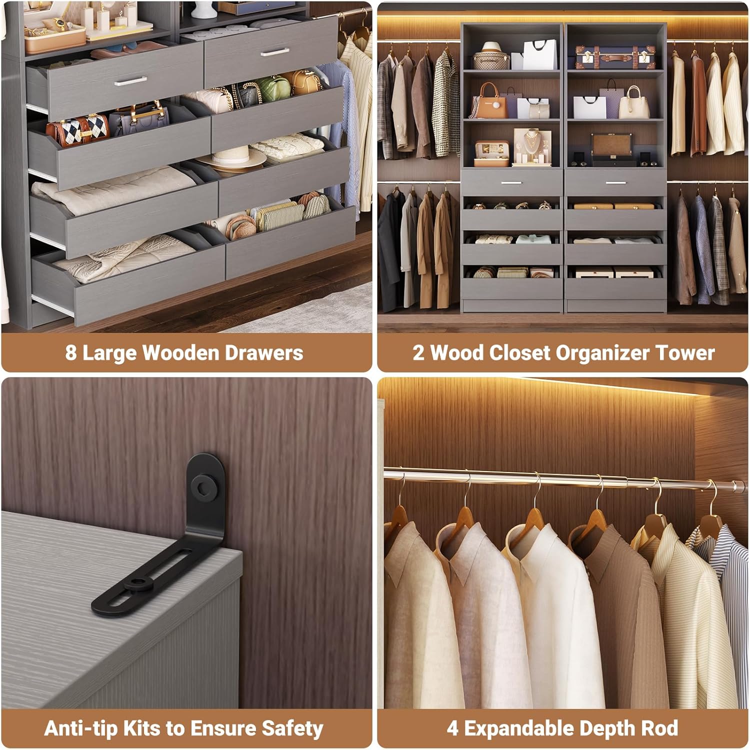 Aheaplus Closet System, 6-15Ft Closet Organizer with 8 Wooden Drawers, Wood Closet Organizer System with Tower, Walk-in Closet Organizer Wardrobe Garment Clothes Rack with 4 Hanging Rods, Grey