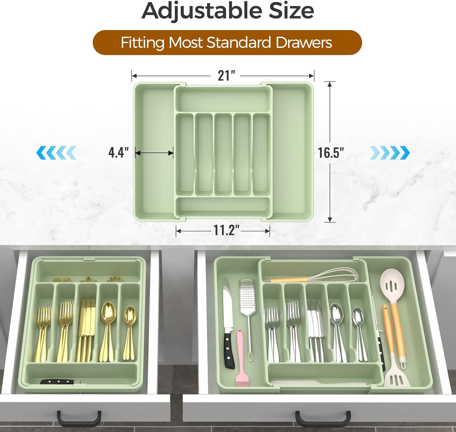 Extra Large Expandable Silverware Organizer, BPA-Free Food-Safe Cutlery Flatware Organizer, Kitchen Utensil Drawer Organizer, Adjustable Silverware Holder for Spoons Forks Knives, Green