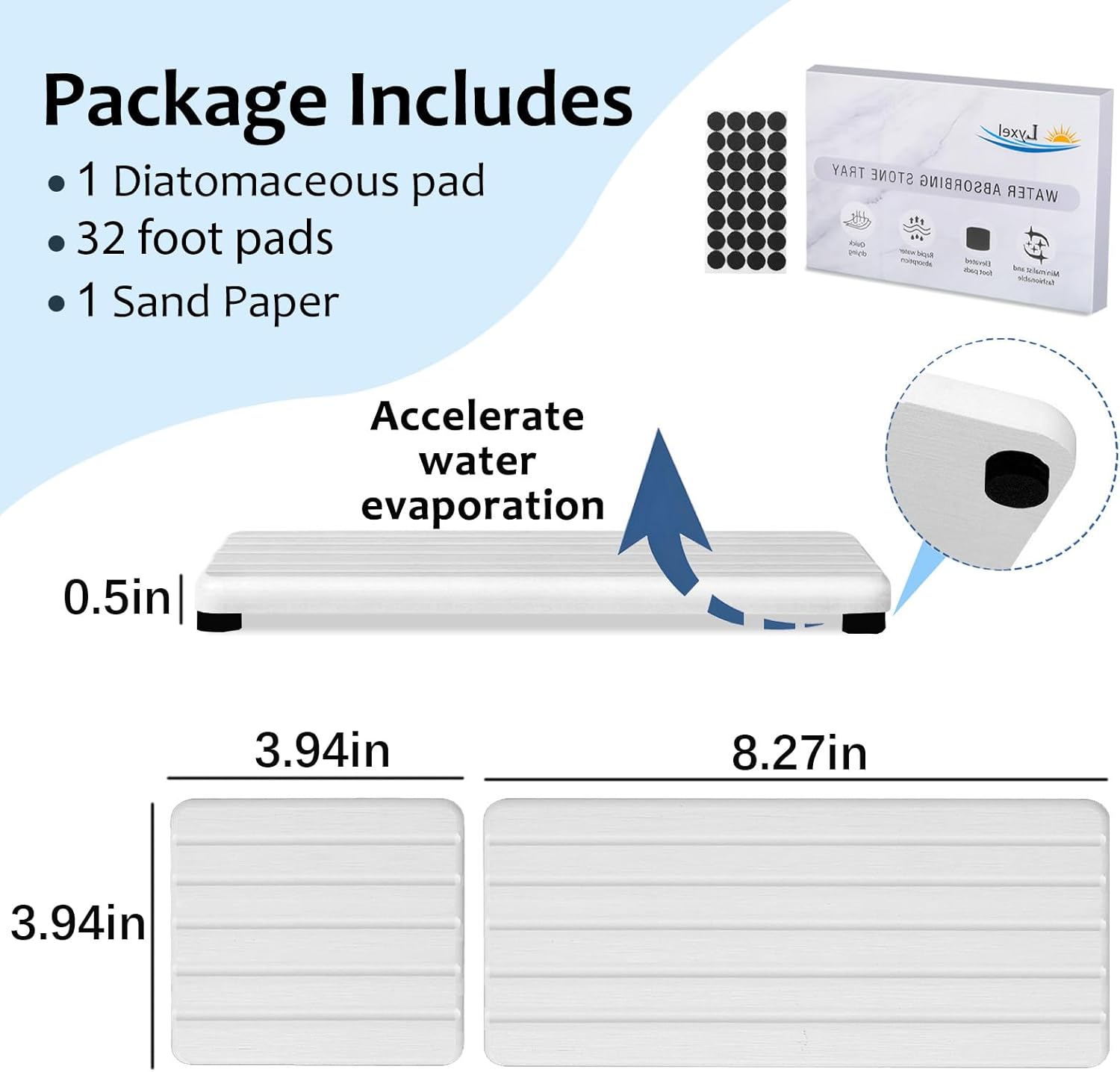 - More Anti Slip and Ventilated --- The silicone footpads boost the slip-resistance of stone drying tray while keeping them out of the bathroom vanity.This design improves the contact surface between fast drying stone sink tray and air, accelerates the evaporation of water,and extends the service life of the water absorbing stone tray for sink.