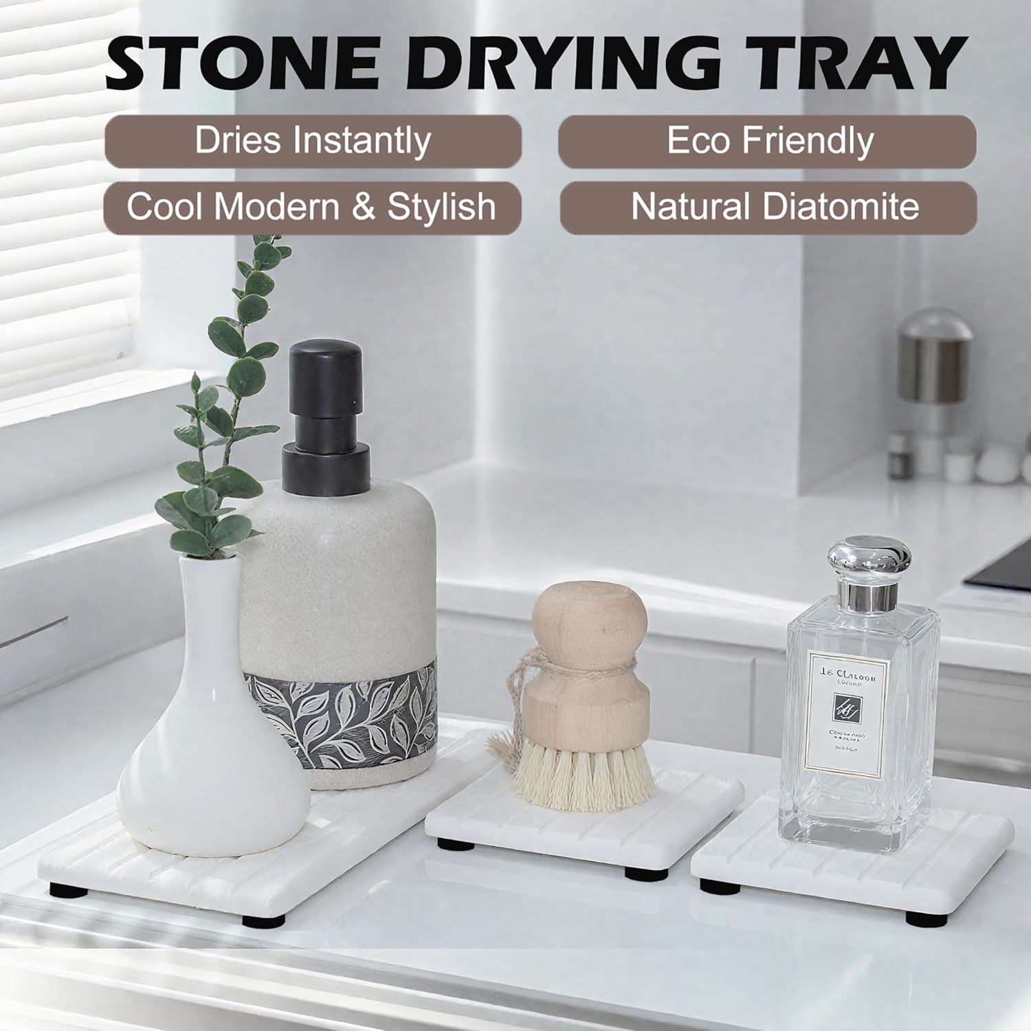 - Multi-use --- This water absorbing stone tray is suitable for bathroom sink, kitchen counter and other scenes. It can be used as soap/water cups/hand soap bottles/dishwashing sponges/make-up bottles etc absorbent pads; Use our absorbent stone trays to keep your sink / counter dry and clean, making life tidy and orderly.