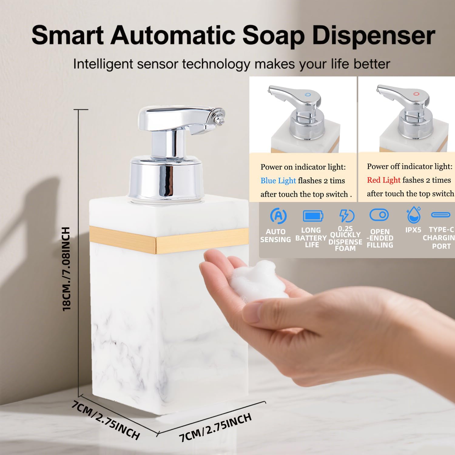 Automatic Foam Soap Dispenser, Touchless Bathroom Kitchen Dish Soap Dispenser with Adjustable Sensor, 7.6oz/225ml USB Rechargeable, Durable Design for Home Commercial Use (White & Gold)