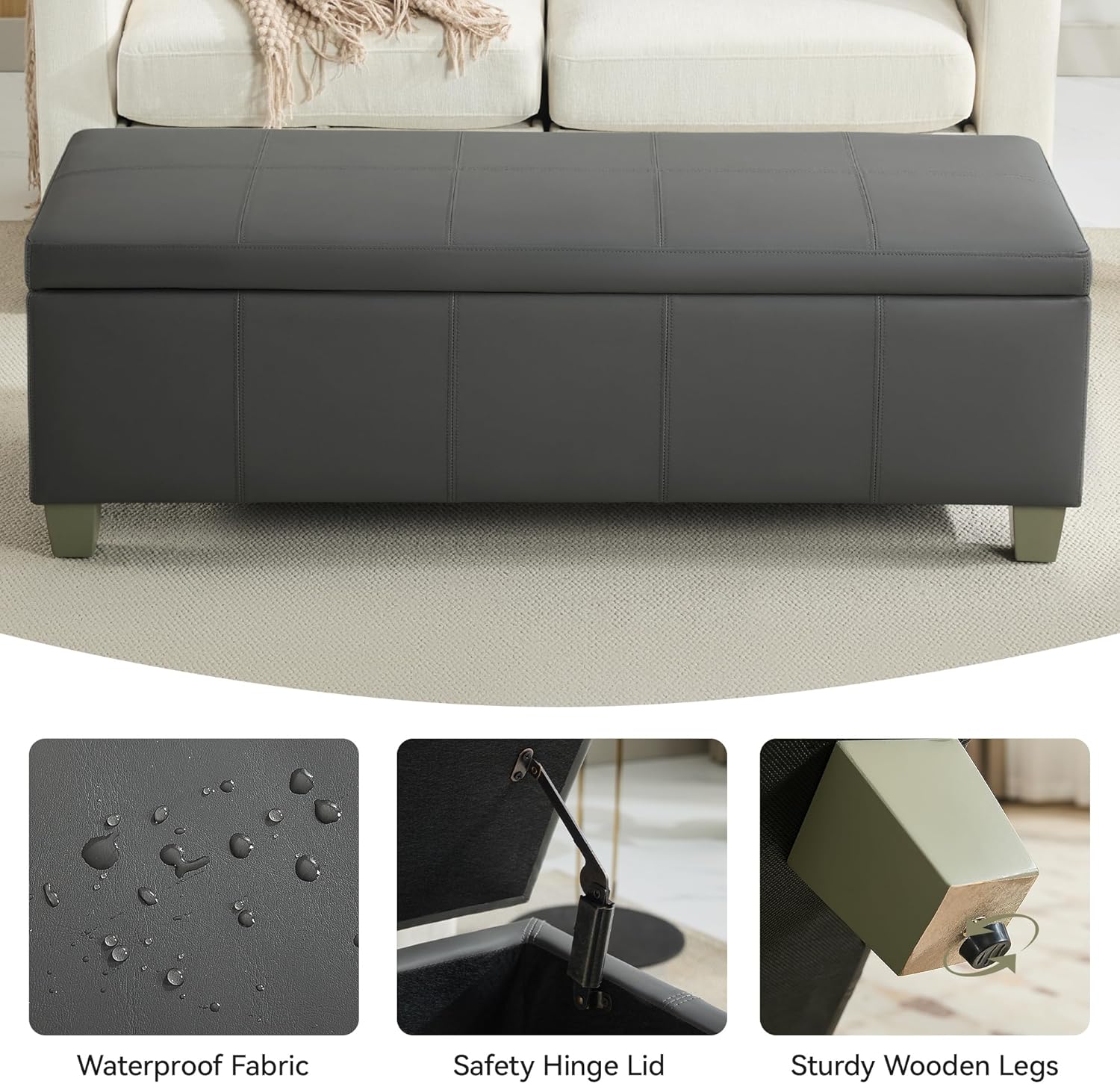 - PREMIUM MATERIALS: Our storage ottoman crafted with premium faux leather and sturdy wooden leg, high elasticity sponge filling the seat cushion, which is waterproof and wear-resistant, this ottoman ensures stability, comfort, and long-lasting quality.
