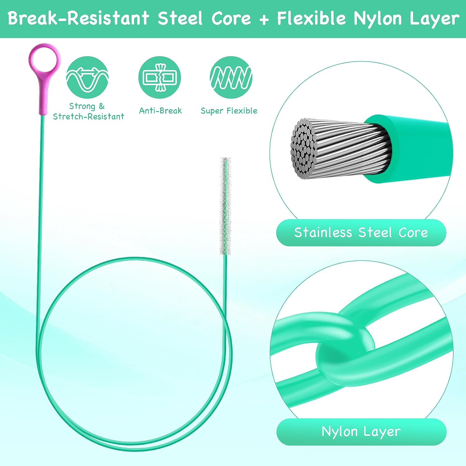 - Reinforced Steel Core with Flexible Nylon Coating:Crafted from stainless steel rope and wrapped in a nylon coating, this drain clog remover tool delivers excellent durability and flexibility. It bends easily through L/P/U/S traps and resists breakage under pressure, making it ideal for long-term use in any plumbing snake for sink or toilet application.